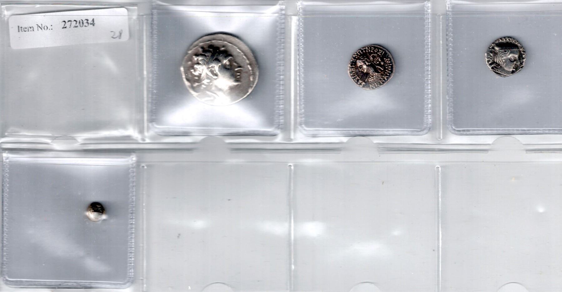 ANCIENT: LOT of 4 coins, Seleucid: Antiochos III Great AR tetradrachm (16.79g), with Apollo Delphios seated left on omphalos, uncertain variety due to obscured control marks, pleasing portrait (VG); Bactria: Menander AR drachm (2.46g), king holding spear, Bop-6A (toned VF scratches); Western Kshatrapas: Vijayasena AR drachm (2.33, bold VF-EF); and Ionia: uncertain EL 1/8 stater (1.70g), with two adjacent rectangular punches (VF); retail value $200, lot of 4 pieces.