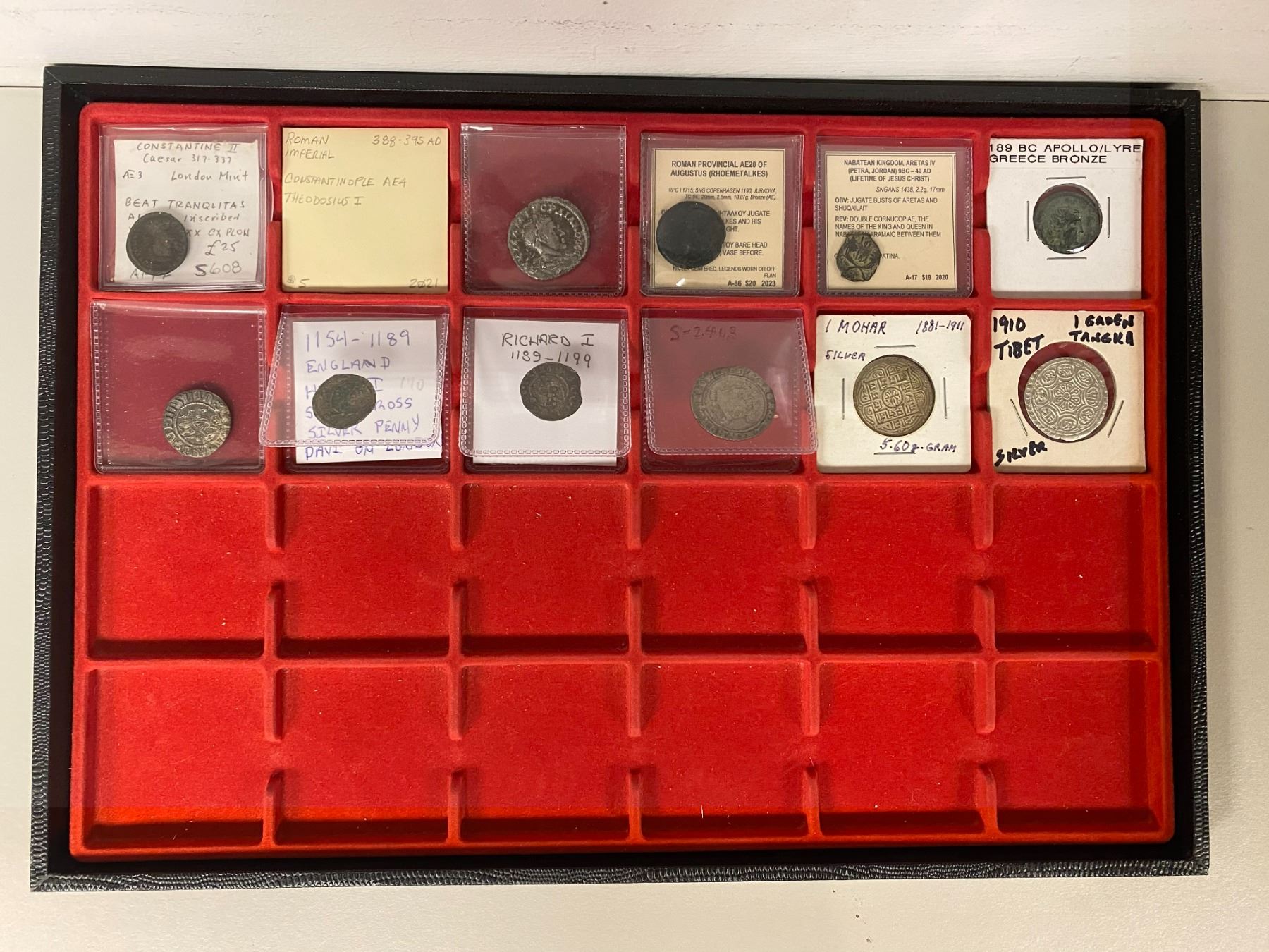 ANCIENT & MEDIEVAL: LOT of 12 coins, some in silver, including Ancient: 2 Roman Imperial, 2 Roman Provincial, 1 Greek, 1 Nabataean; Medieval: 3 of England (Henry II & Richard I pennies, and a Henry VIII groat), 1 of Armenian Cilicia; plus one each of Nepal and Tibet; all in average circulated conditions, most attributed; retail value $250, lot of 12 pieces.