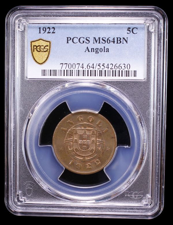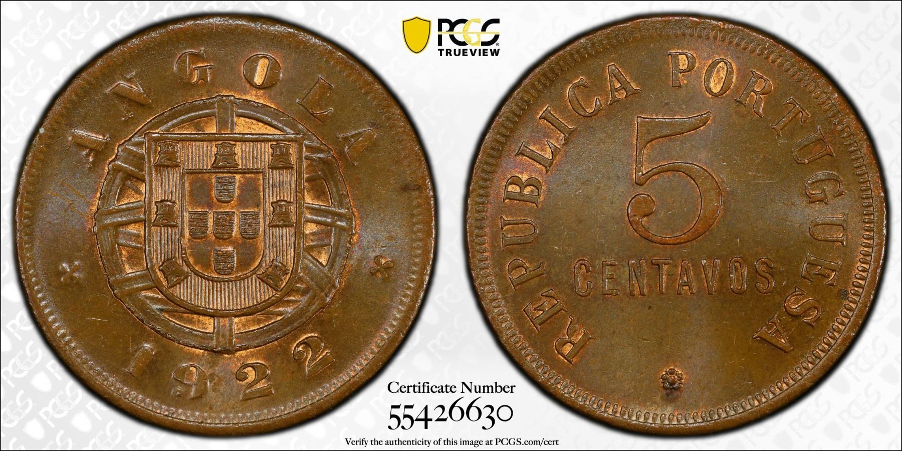 ANGOLA: Portuguese Colony, AE 5 centavos, 1922, PCGS MS64 BN