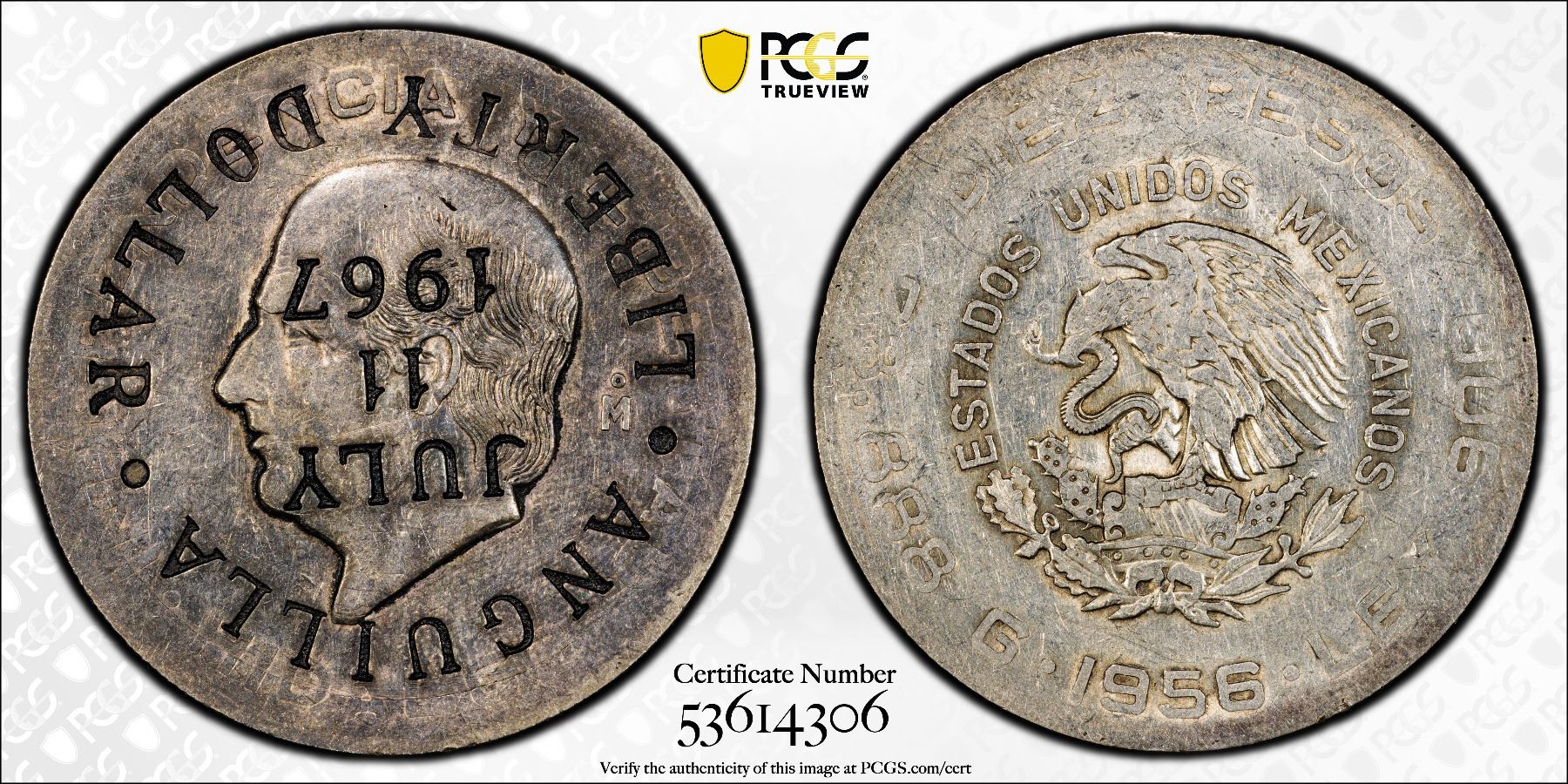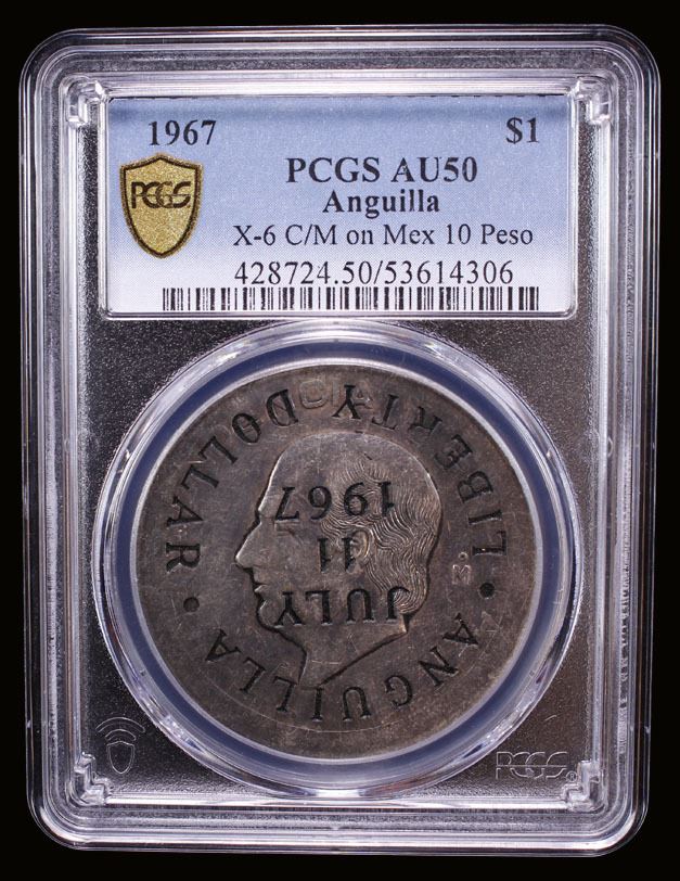 ANGUILLA: Provisional Government, AR liberty dollar, 1967, Bruce-X1, countermark on 1956 Mexico 5 pesos KM-469, a lovely example! PCGS graded AU50. These countermarked coins, "Anguilla Liberty Dollar, July 11, 1967", were made by Scott Newhall, then-editor of the San Francisco Chronicle. Always on the lookout for a zany antic to splash across the editorial pages of the Chronicle, Newhall embraced the so-called Anguillan revolution of 1967. To facilitate commerce for the revolutionaries, Newhall, an avid coin collector, took 11,600 dollar-sized silver coins and countermarked them in the basement of the Chronicle building in San Francisco. The idea was Newhall would be recompensed for his actual costs, and the new Anguillan government would sell the coins to collectors at a surcharge and keep the profits. It bombed. Just 2,000 to 3,000 were put into commerce, and Newhall was stuck with the balance of the defaced coins, which he eventually sold for the melt price of silver. Many more were melted in the following years and they are now becoming scarce.