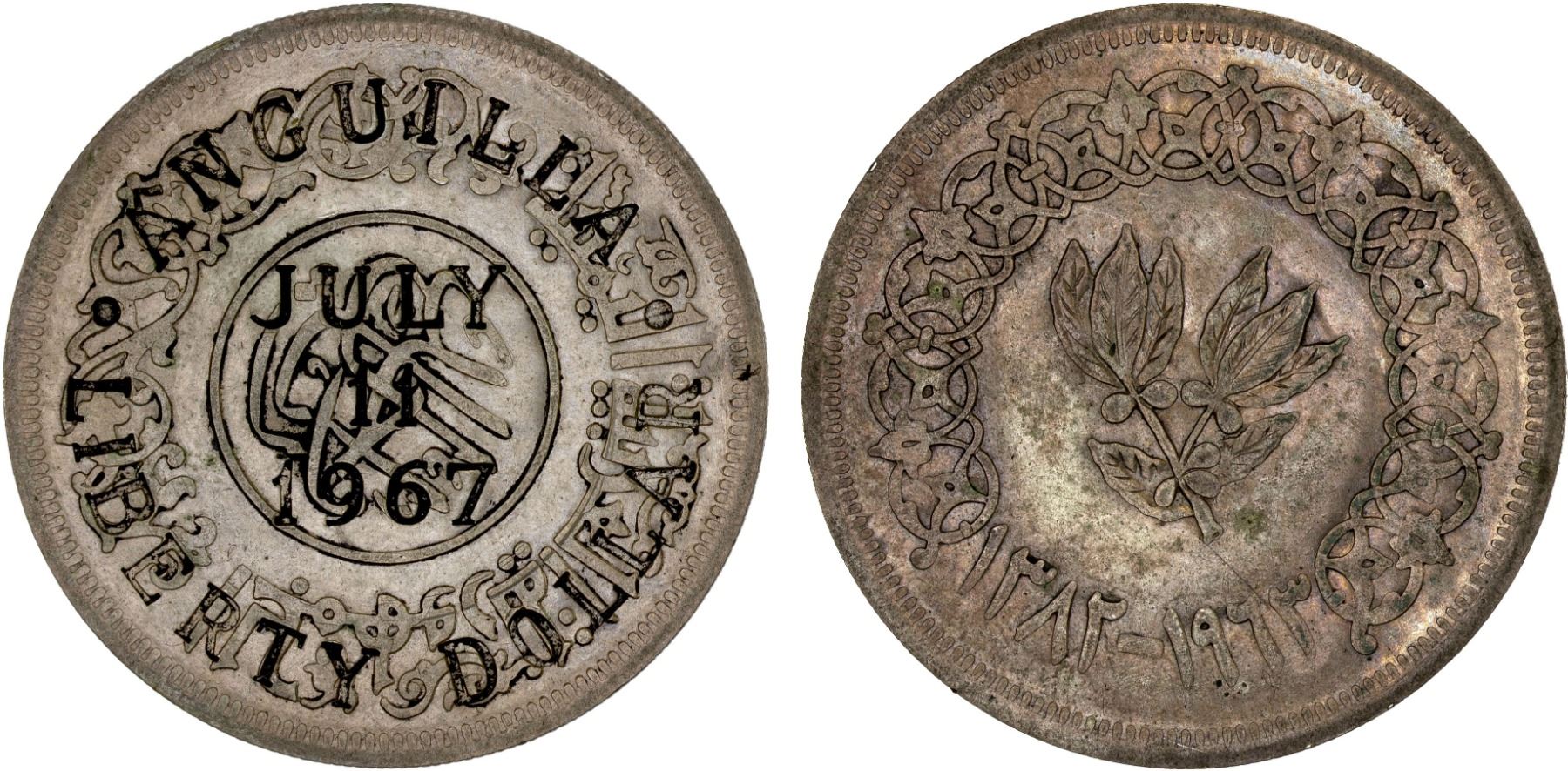 ANGUILLA: Republic, AR liberty dollar, 1967, KM-X4.2, countermark on 1963 Yemen riyal, XF. These counterstamped coins, "Anguilla Liberty Dollar, July 11, 1967," were made by Scott Newhall, then-editor of the San Francisco Chronicle. Always on the lookout for a zany antic to splash across the editorial pages of the Chronicle, Newhall embraced the so-called Anguillan revolution of 1967. To facilitate commerce for the revolutionaries, Newhall, an avid coin collector, took 11,600 dollar-sized silver coins and counterstamped them in the basement of the Chronicle building in San Francisco. The idea was Newhall would be recompensed for his actual costs, and the new Anguillan government would sell the coins to collectors at a surcharge and keep the profits. It bombed. Just 2,000 to 3,000 were put into commerce, and Newhall was stuck with the balance of the defaced coins, which he eventually sold for the melt price of silver. Many more were melted in the following years and they are now becoming scarce.
