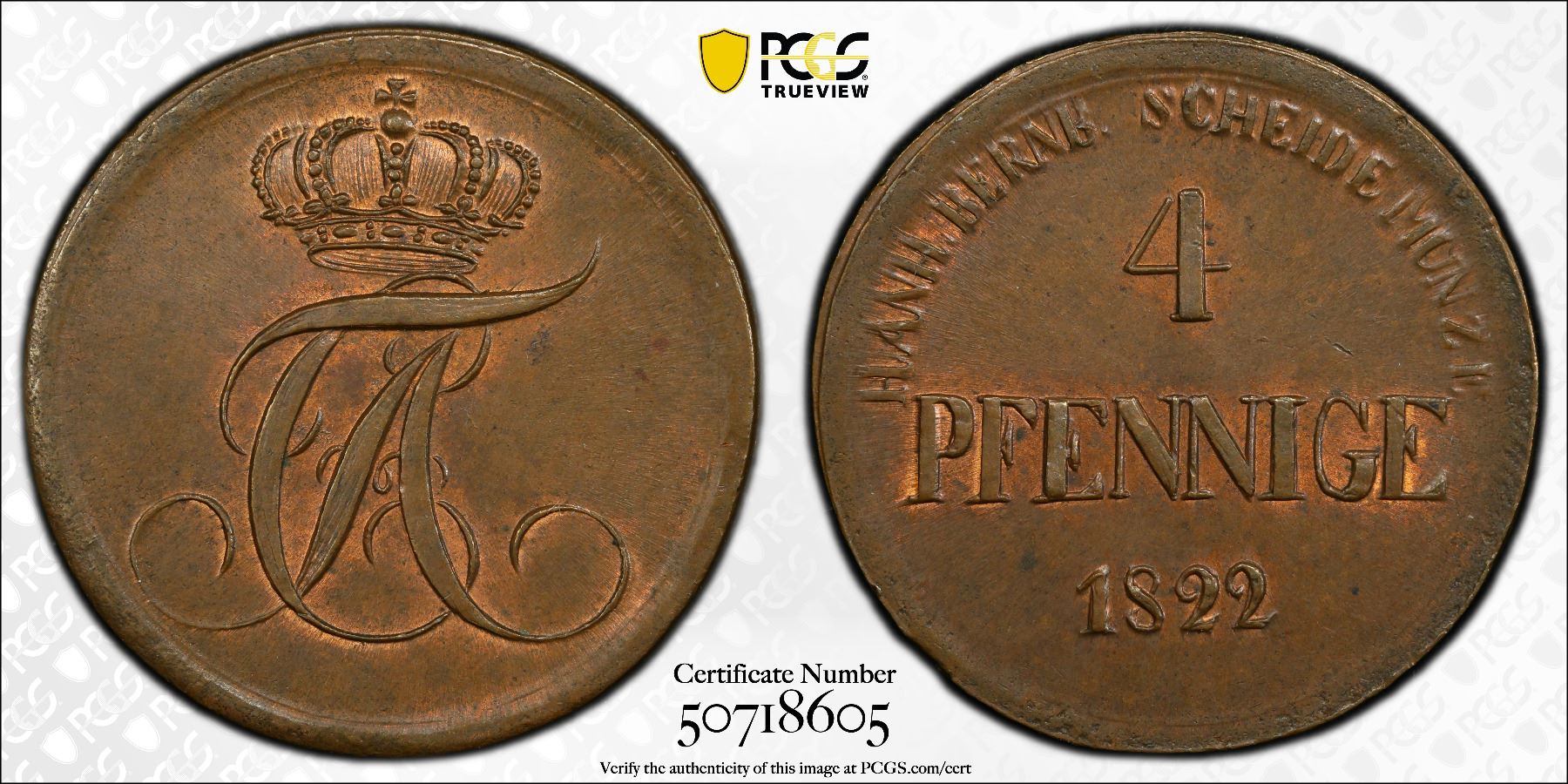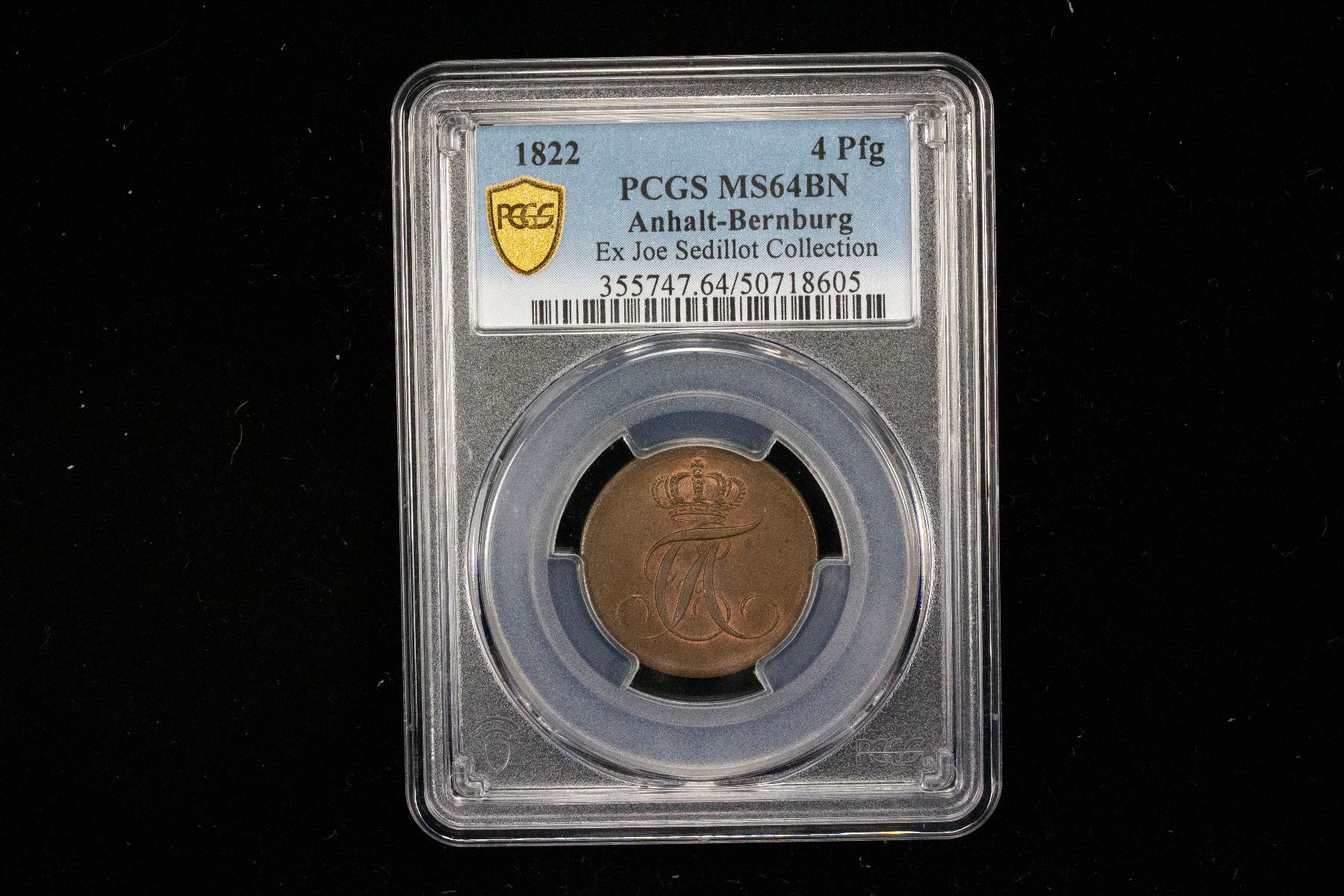 ANHALT-BERNBURG: Alexis Friedrich Christian, 1803-1834, AE 4 pfennig, 1822, KM-78.1, C-59, a wonderful lustrous chocolate brown mint state example! PCGS graded MS64 BN, ex Joe Sedillot Collection. Alexius improved education with the building and enlargement of many churches and schools. He demonstrated a special interest in expanding the road network, especially in the newly acquired areas of his principality. The mining and metallurgical industry also benefited from his attention. Alexius Frederick Christian initiated several major construction projects, such as the Saalebrücke in Bernburg (Saale), which was later destroyed. In 1810 he founded the Alexisbad in Selketal and later, in the Prussian area of Gernrode, he created the Beringer Bad. He was tolerant and enlightened; in 1820 he finally declared the Reformist and Lutheran faiths to be the official co-religions of his state. In 1826 he joined the German Zollverein and in 1829 created a civil fund for orphans, widows, and servants.