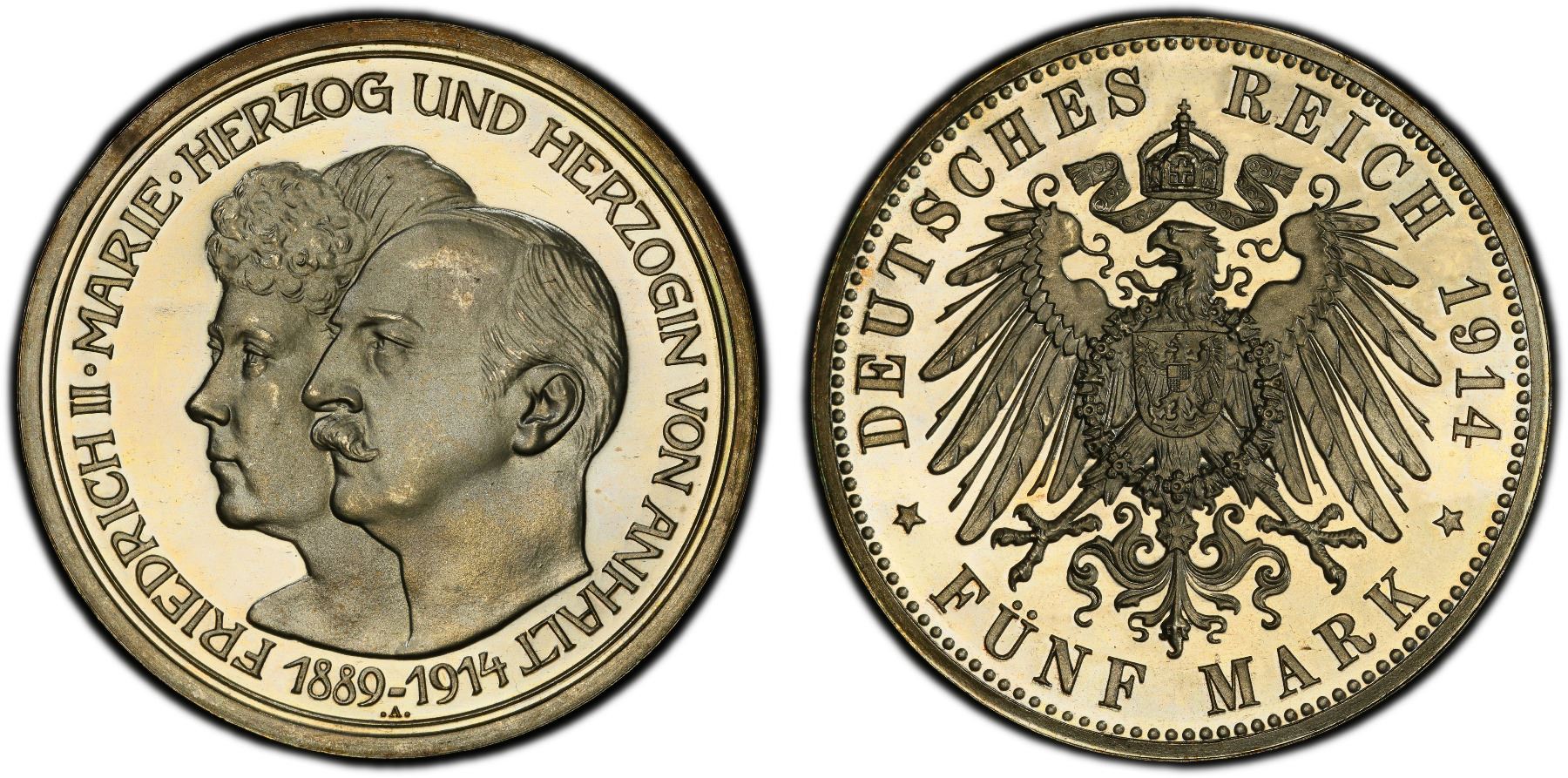 ANHALT-DESSAU: Friedrich II, 1901-1918, AR 5 mark, 1914-A, PCGS Proof 65 CAM