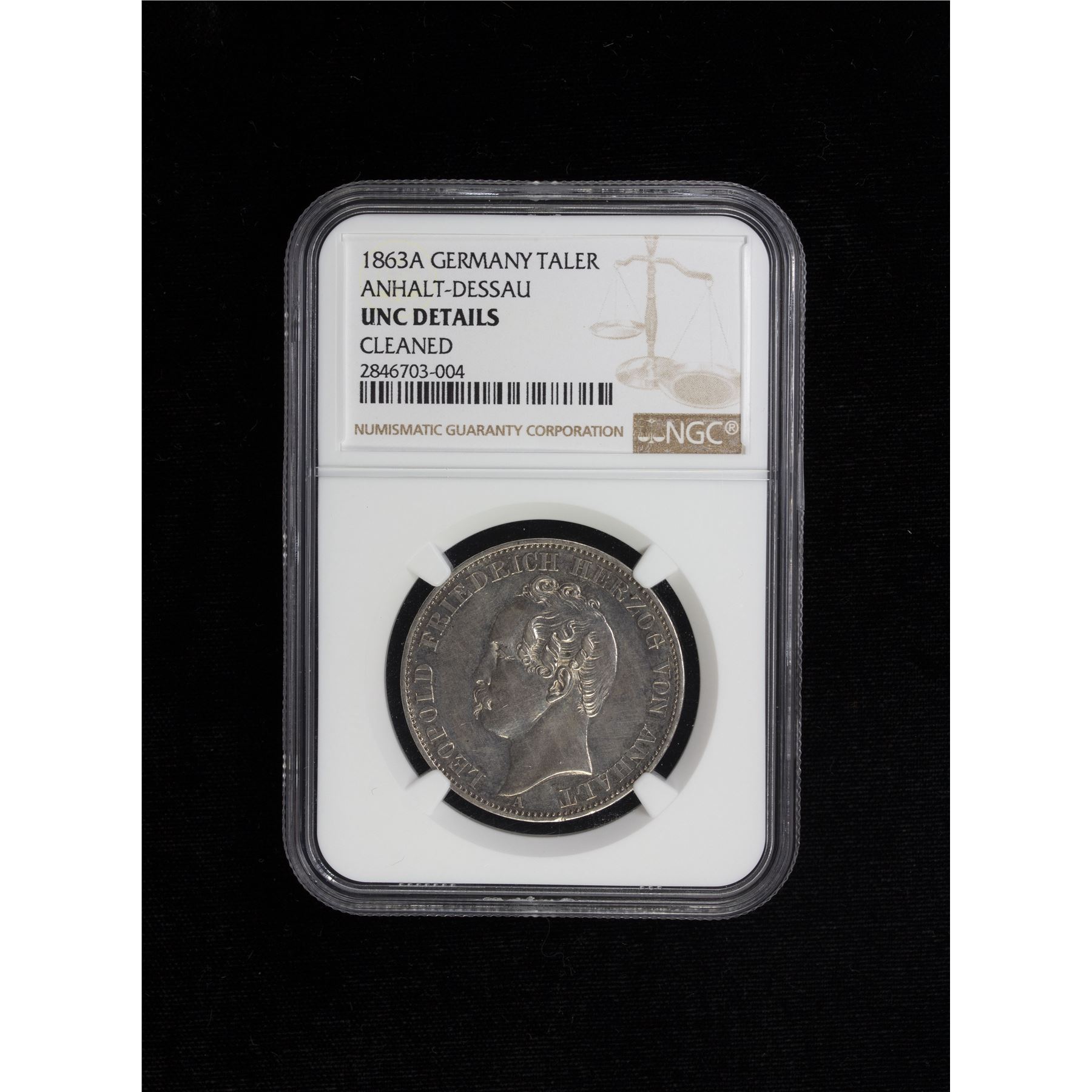 ANHALT-DESSAU: Leopold IV Frederick, 1817-1871, AR thaler, 1863-A, KM-15, Reunification of the Anhalt Duchies on the 19th of August 1863, cleaned, NGC graded Unc details.