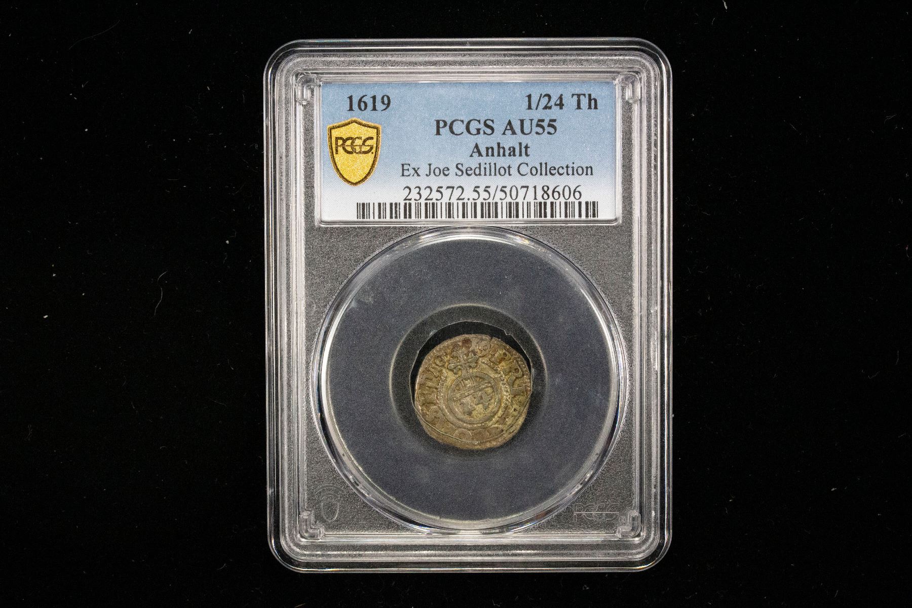 ANHALT: John Casimir, 1618-1660, AR 1/24 thaler (groschen), 1619, KM-16, scarce, a well struck lustrous example, PCGS graded AU55, ex Joe Sedillot Collection. Finest graded 'top pop' by PCGS!In 1618, after the death of his father, John Casimir succeeded him in Anhalt-Dessau, but the tasks of government were carried out by a committee of court officials, because the new prince devoted much of his time to hunting. A hunting accident on 4 October 1652 left him confined to bed for several years. During this time, in order to distract him, the famous poet and writer Philipp von Zesen was employed in his household.