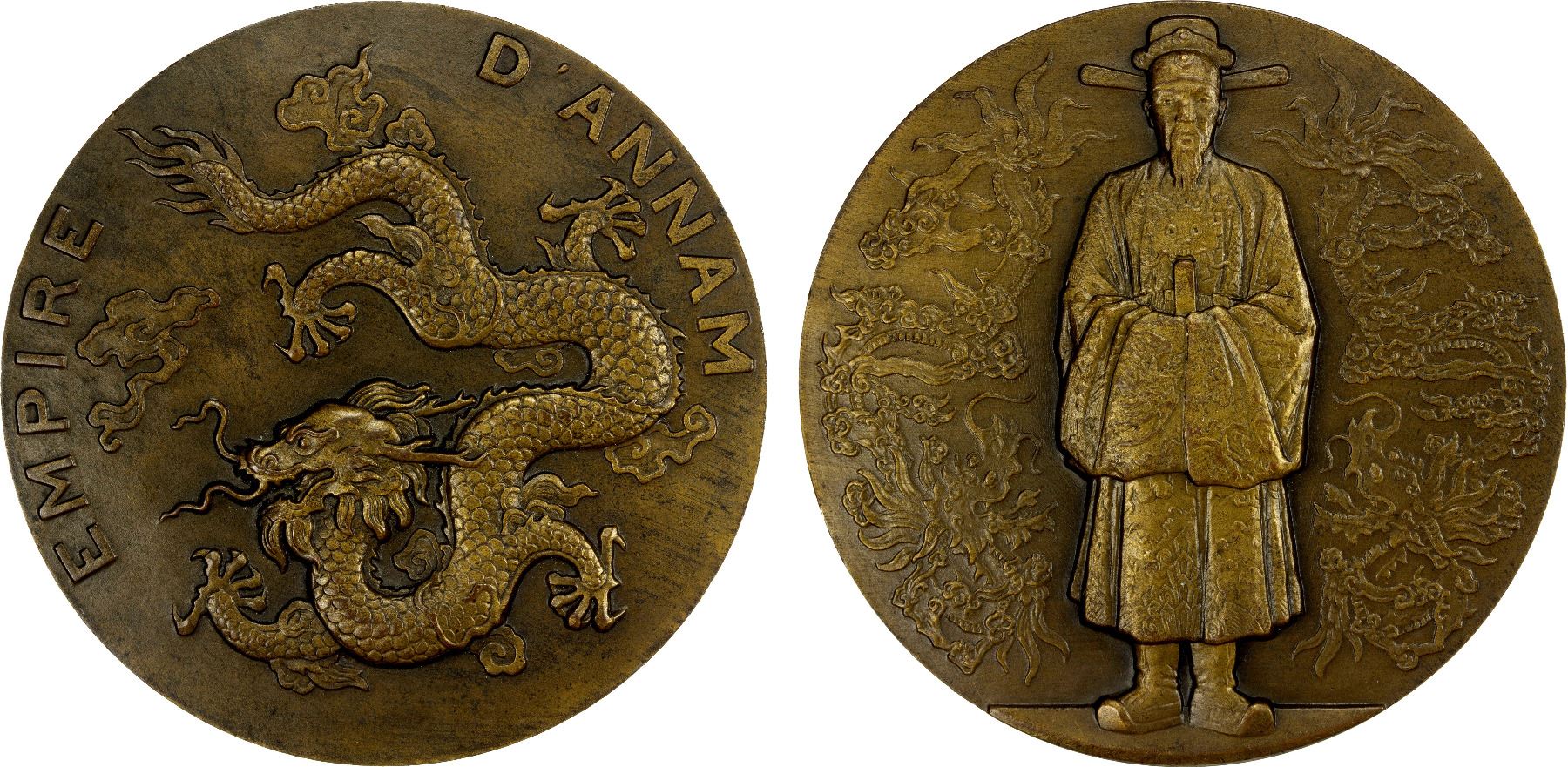 ANNAM: French Colony, AE medal (112.2g), ND (1930), Ruedas-21 (Extreme-Orient), 59mm unsigned bronze medal for the Paris Colonial Exhibition by Emile Lindauer, Paris Mint issue, large dragon left with EMPIRE - D'ANNAM around // standing facing Annamese dignitary, in traditional costume, with many arabesques on both sides representing dragons, one of a set of medals depicting the far eastern colonies of France, BRONZE and cornucopia privy mark on edge, Choice Unc.
