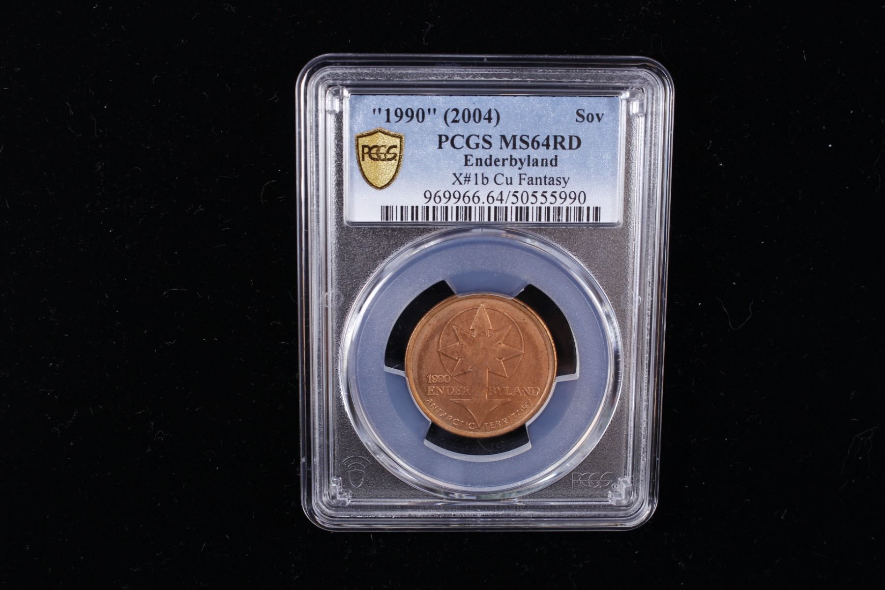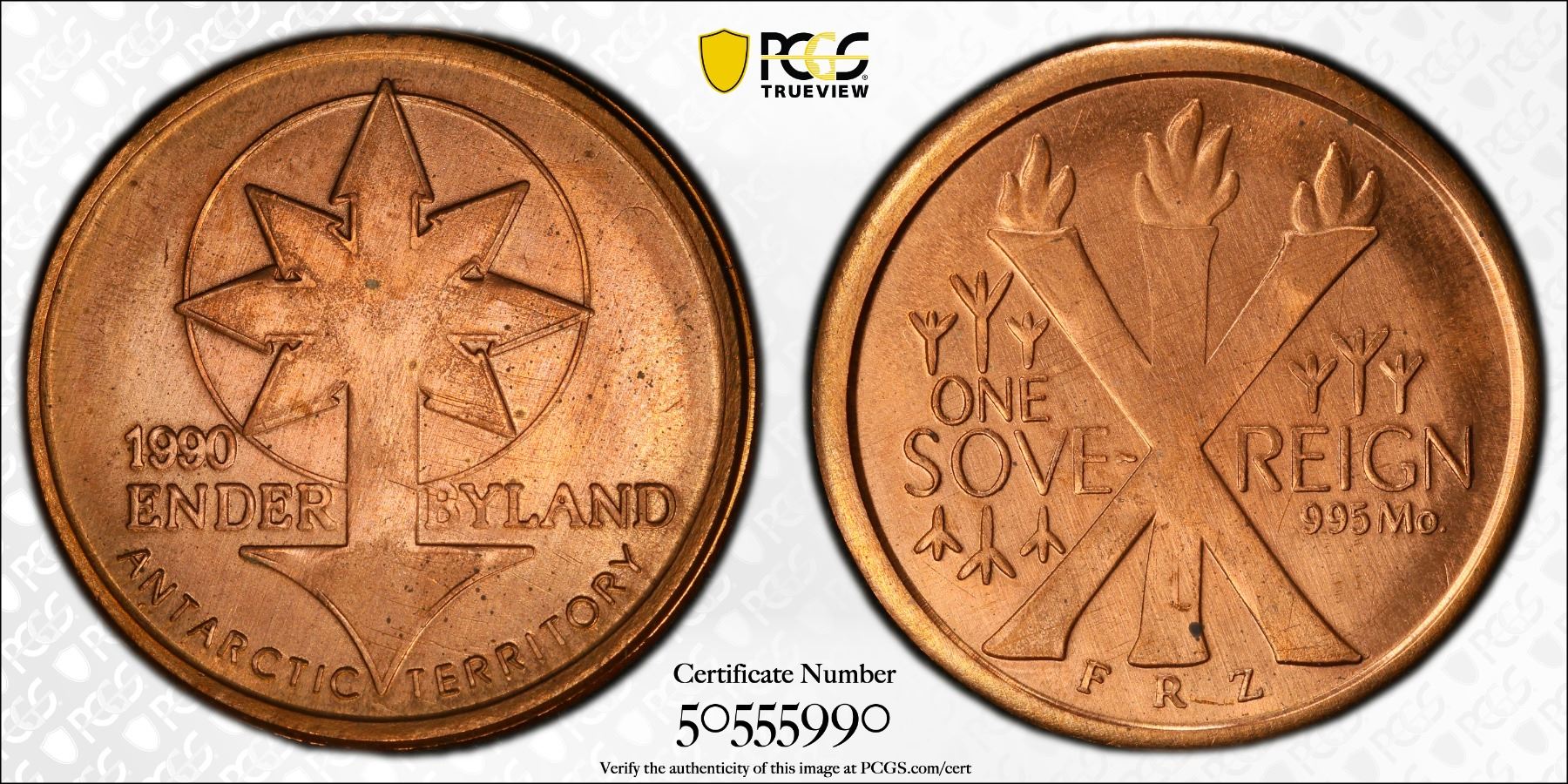 ANTARCTICA: Enderbyland, 1 sovereign, 1990, KM-X1b, fantasy issue struck in copper, arrowed symbol // enflamed Runic symbol, mintage of only 250 pieces, rare, PCGS graded MS64 RD. Enderbyland is a region of Antarctica between Queen Maud Land and Wilkes Land, claimed by Australia as part of the Australian Antarctic Territory. Enderbyland is named for the whaling company, Samuel Enderby & Sons, which financed the 1831 expedition that discovered it. This type was struck by Fred Zinkann at the Mint Masters private mint, Franklin Park, Illinois, USA.