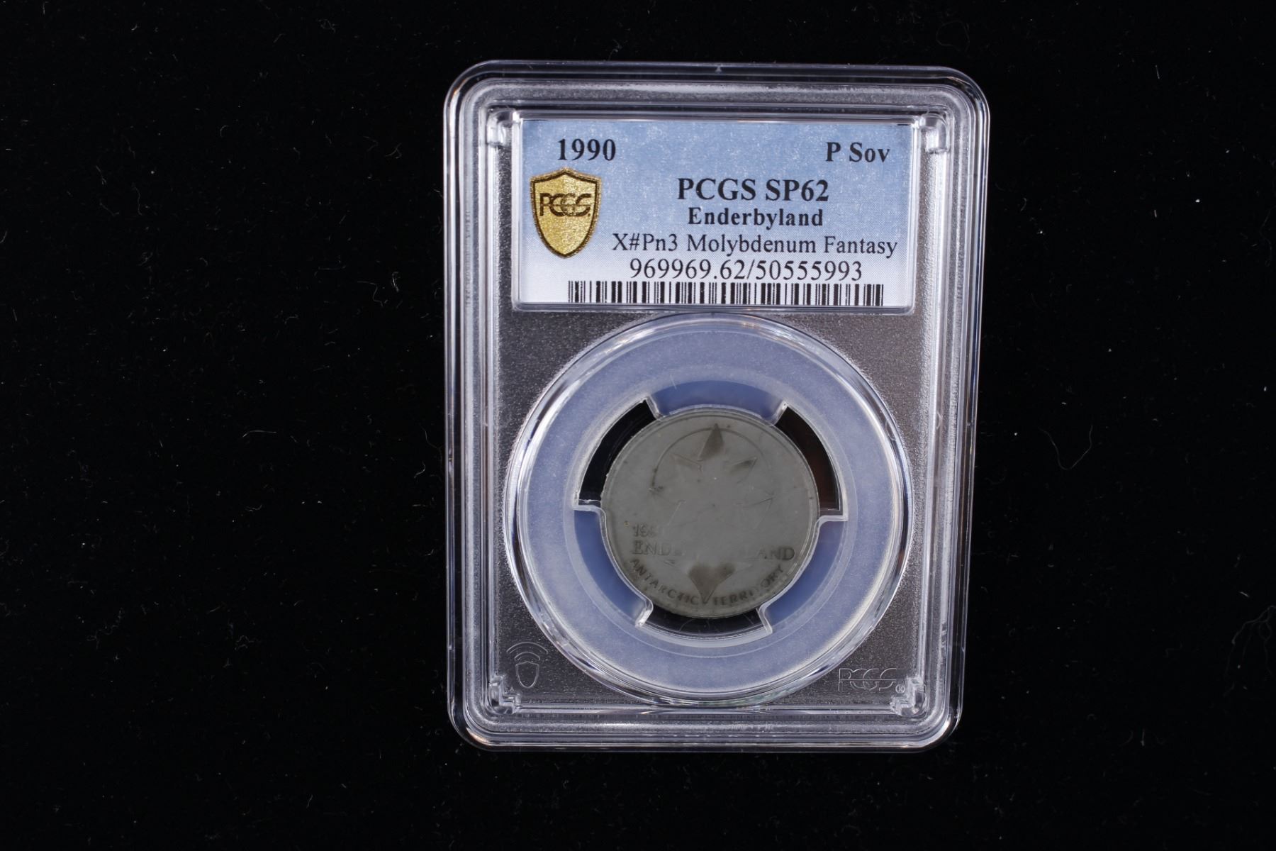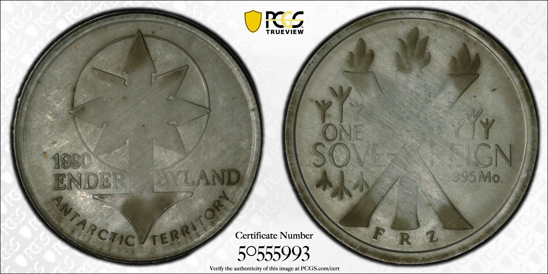 ANTARCTICA: Enderbyland, 1 sovereign, 1990, KM-XPn3, fantasy issue struck in .995 molybdenum, arrowed symbol // enflamed Runic symbol, weakly struck, mintage of only 5 pieces, extremely rare, PCGS graded Specimen 64. Enderbyland is a region of Antarctica between Queen Maud Land and Wilkes Land, claimed by Australia as part of the Australian Antarctic Territory. Enderbyland is named for the whaling company, Samuel Enderby & Sons, which financed the 1831 expedition that discovered it. This type was struck by Fred Zinkann at the Mint Masters private mint, Franklin Park, Illinois, USA. Molybdenum is a silvery-white element usually used as an alloying addition to steels and titanium alloys, although there are applications where the pure metal is used. It has not been used for circulation coins.