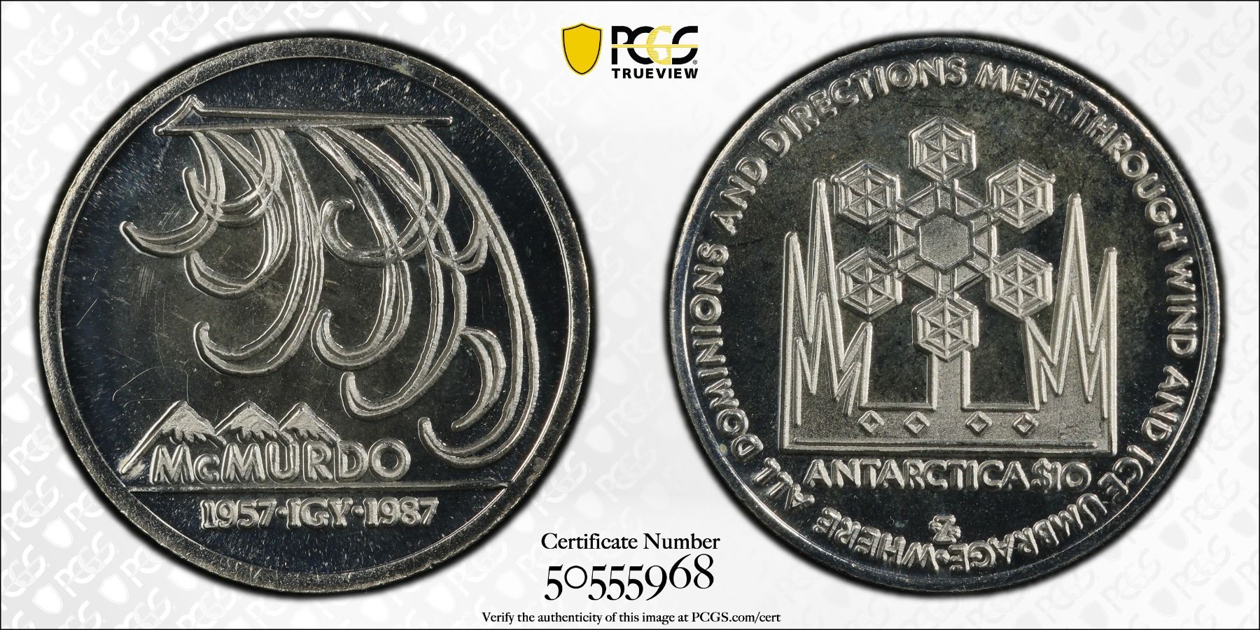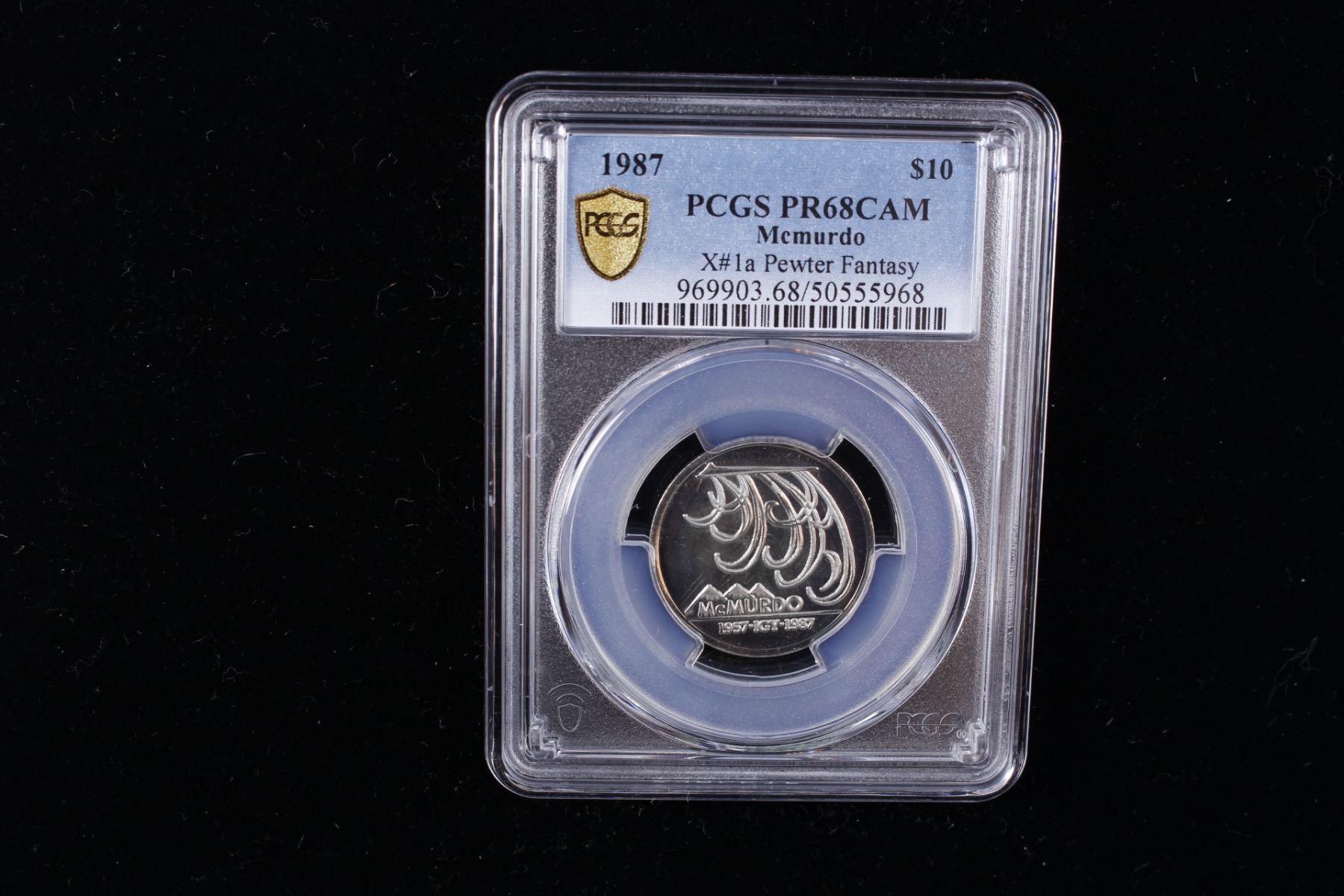 ANTARCTICA: McMurdo Station, 10 dollars, 1987, KM-X1a, fantasy issue in pewter for the research station on Ross Island, Antarctic Landscape - stylized winds above three mountain peaks, McMURDO / 1957 IGY 1987 below // ornate hexagonal "atom" design in rays topping "Ice Crown", ANTARCTICA below, WHERE ALL DOMINIONS AND DIRECTIONS MEET THROUGH WIND AND ICE UMBRAGE in outer legend, mintage of only 75 pieces, very rare, PCGS graded Proof 68 CAM. Fantasy type struck by Fred Zinkann at the Mint Masters private mint, Franklin Park, Illinois, USA.