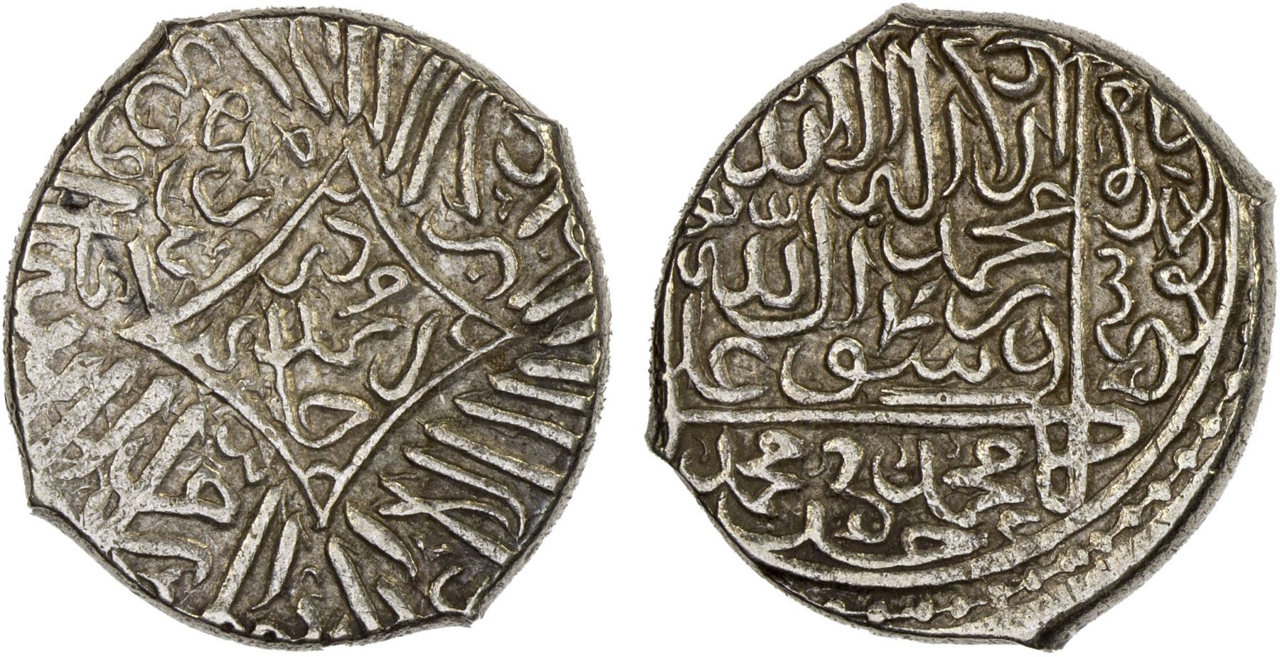 AQ QOYUNLU: Muhammad, 1498-1500, AR "heavy" tanka (4.71g), Yazd, AH904, A-U2542.2, bipartisan Sunni & Shi'ite type, citing the first 3 Sunni and 8 of the Shi'ite Imams in the reverse margins, the four Shi'ite Imams names 'Ali arranged in the corners of the reverse field (the first Shi'ite Ali was also the 4th Sunni Imam); wonderful strike on a normal weight tanka, XF, RRR. U2542 and V2542 are the first known bipartisan religious types of the Aq Qoyunlu.