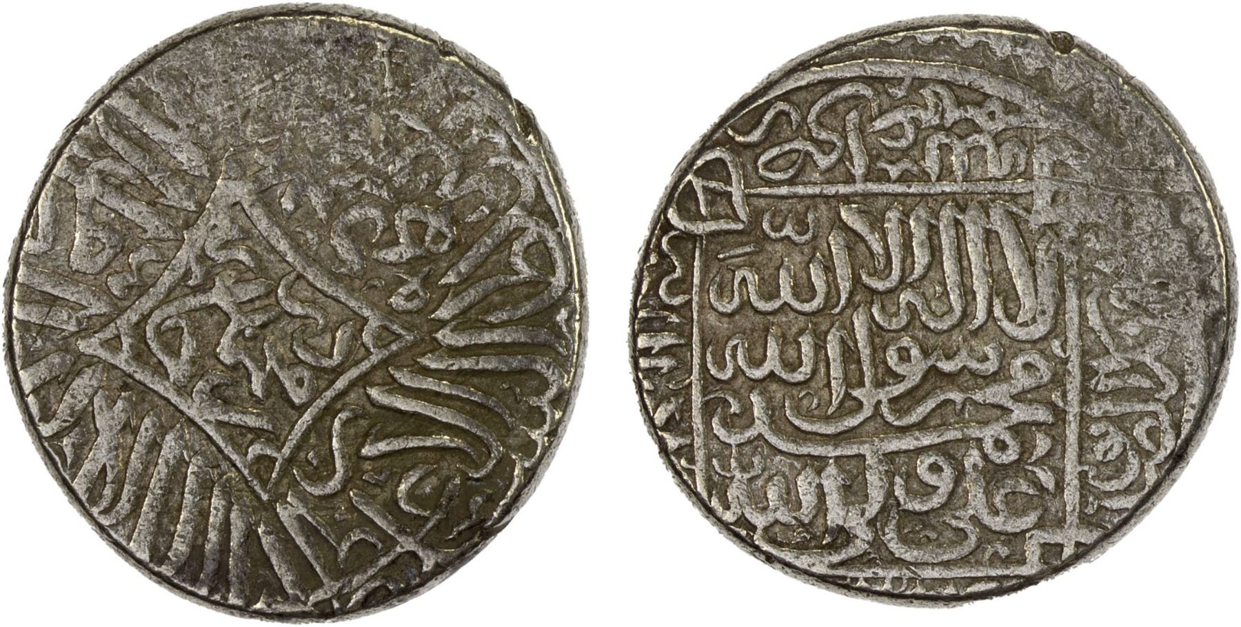 AQ QOYUNLU: Muhammad, 1498-1500, AR heavy tanka (5.53g), Yazd, AH904, A-U2542.1, bipartisan Sunni & Shi'ite type, citing the 4 Sunni Imams Abu Bakr, 'Uthman, 'Umar, and 'Ali, but 'Ali with his Shi'ite title 'ali wali Allah; ornate detailed design, slight weakness, VF-XF, RR. U2542 and V2542 are the first known bipartisan religious types of the Aq Qoyunlu.