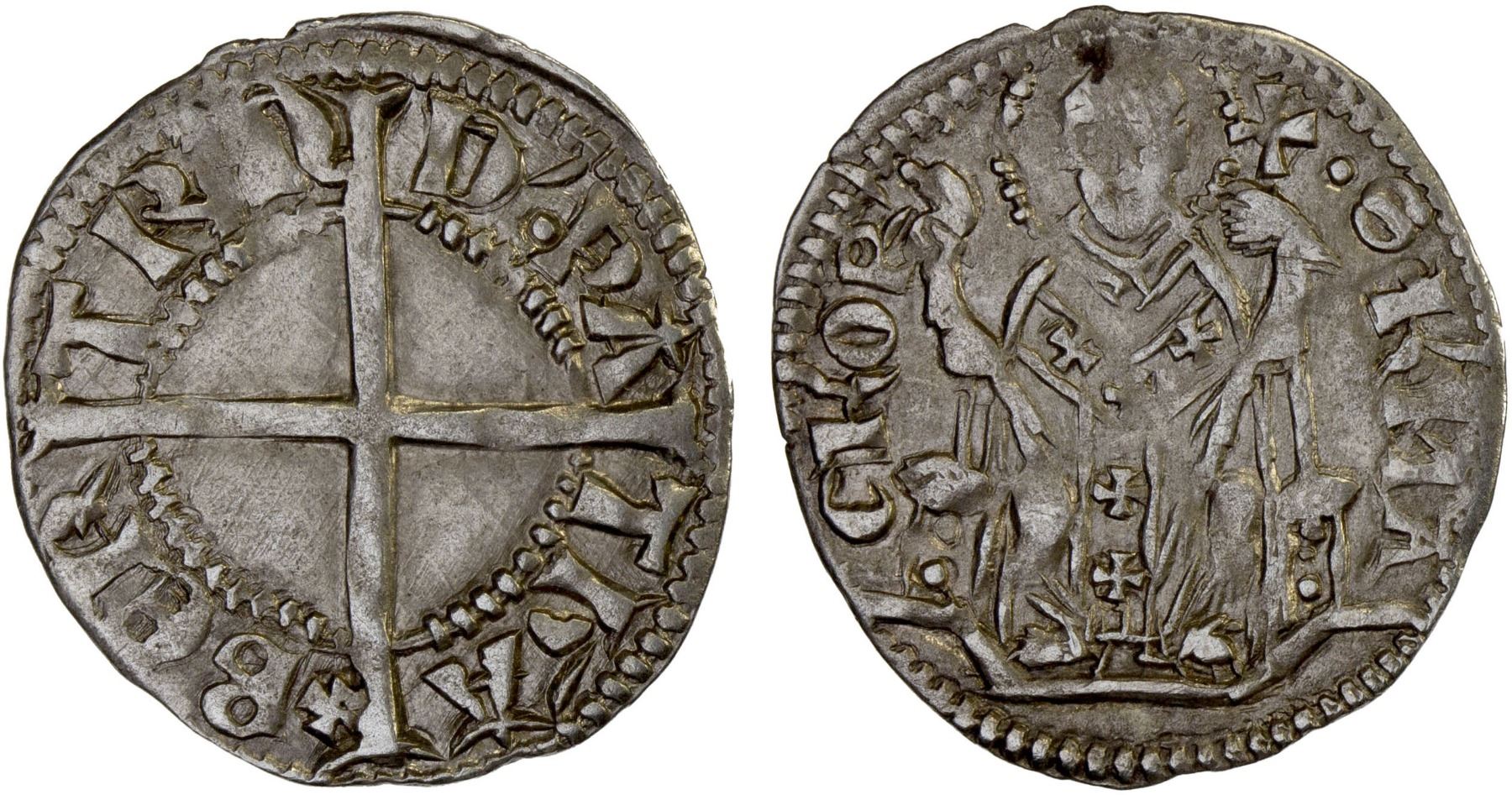 AQUILEIA: Bertrando of San Genesio, 1334-1350, AR denaro (0.97g), Biaggi-171, MIR-38, long cross pattée, + BER-TRAN-D PA-TRA // St. Hermagoras seated facing, faint hairlines on obverse, VF-XF.