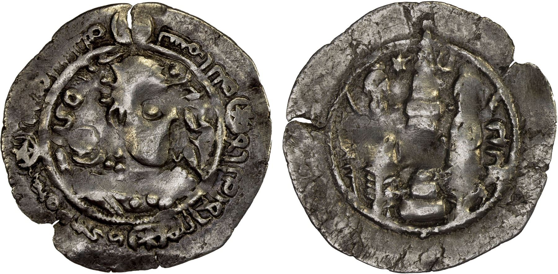 ARAB-ARMENIAN: Anonymous, early 700s, AR zuzun (2.76g), NM, stylized year "6", A-M97, in the name of the Sasanian king Hormizd IV, with the full Shahada filling the obverse margin after the phrase bism Allah, and with the denomination ZWZWN, Aramaic for "drachm", instead of a mint name on the standard position on the reverse, excellent strike for this type, XF, RRRR. There are three genuine examples of this type with the full Shahada posted on Zeno, #96964 with the additional phrase "rabbi Allah" added on the reverse margin (sold in M&E Auction 48, Lot 1), #153562 with "rabbi Allah" instead of ZWZWN at the mint location on the reverse, and #314067, without "rabbi Allah" (sold in our Auction 46, lot 173). The full Shahada was introduced on the Arab-Sasanian coinage during the governorship of al-Hajjaj b. Yusuf (694-713), whence it seems likely that this type could not have been introduced before 694, replaced shortly afterwards by the type that replaced the name Hormizd with Muhammad (A-E97) and the Arabic word "waf" in the obverse margin, introduced circa 700. The prototype was the relatively common Sasanian-Armenian type in the name of Hormizd, usually with year "6" and the phrase ZWZWN in lieu of a mint name (e.g., Zeno-17577).