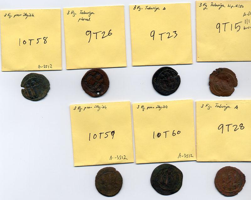 ARAB-BYZANTINE: AE fals, Tabariya, A-3512, Group Lot: Three Standing Figures, thin broad flans, vg to fine, some better grade but very porous surfaces, a few reasonably attractive (7 pieces), from an American collection.  The Three Standing Figures type was derived from the late issues of Heraclius, who is portrayed together with his son Heraclius Constanine and the Empress Martina. On the Arab-Byzantine coins, the three characters tend to be identically engraved, although the central figure may be taller. A small research group. The broad flan subtype is generally believed to be earlier than the narrower flan issues.