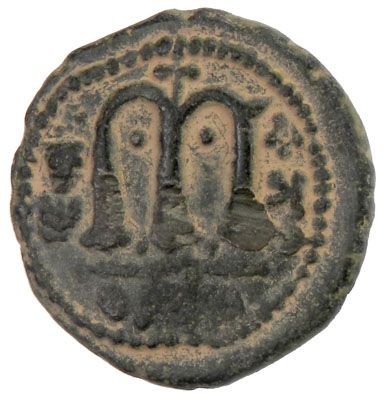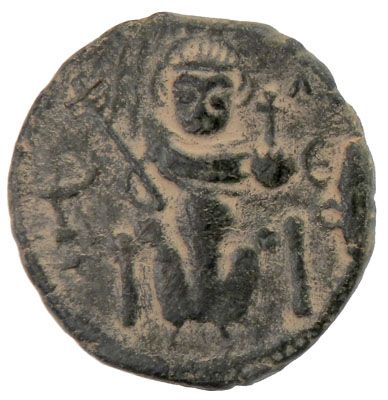 ARAB-BYZANTINE: Enthroned Emperor, ca. 680s-690s, AE fals (4.34g), "pseudo-Damascus ", A-3511A, blundered bird on T left, ?EO to right / cross above retrograde cursive m, blundered text around, VF, R.