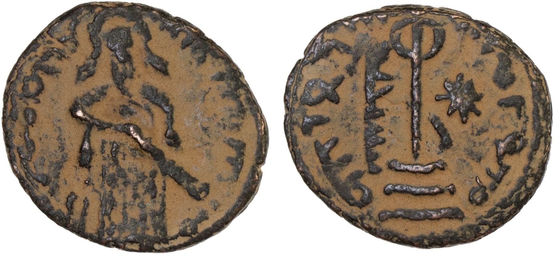 ARAB-BYZANTINE: Standing Caliph, ca. 692-697, AE fals (2.60g), Sinjar, A-3539S, Goodwin-208 (same reverse die), citing the caliph 'Abd al-Malik (685-705) // mint name to left, star to right, superb VF, RRR. Sinjâr was located about 60km south of Aleppo (Halab), just over halfway to Hama (still on Google Maps) and with the region known as Qinnasrin.