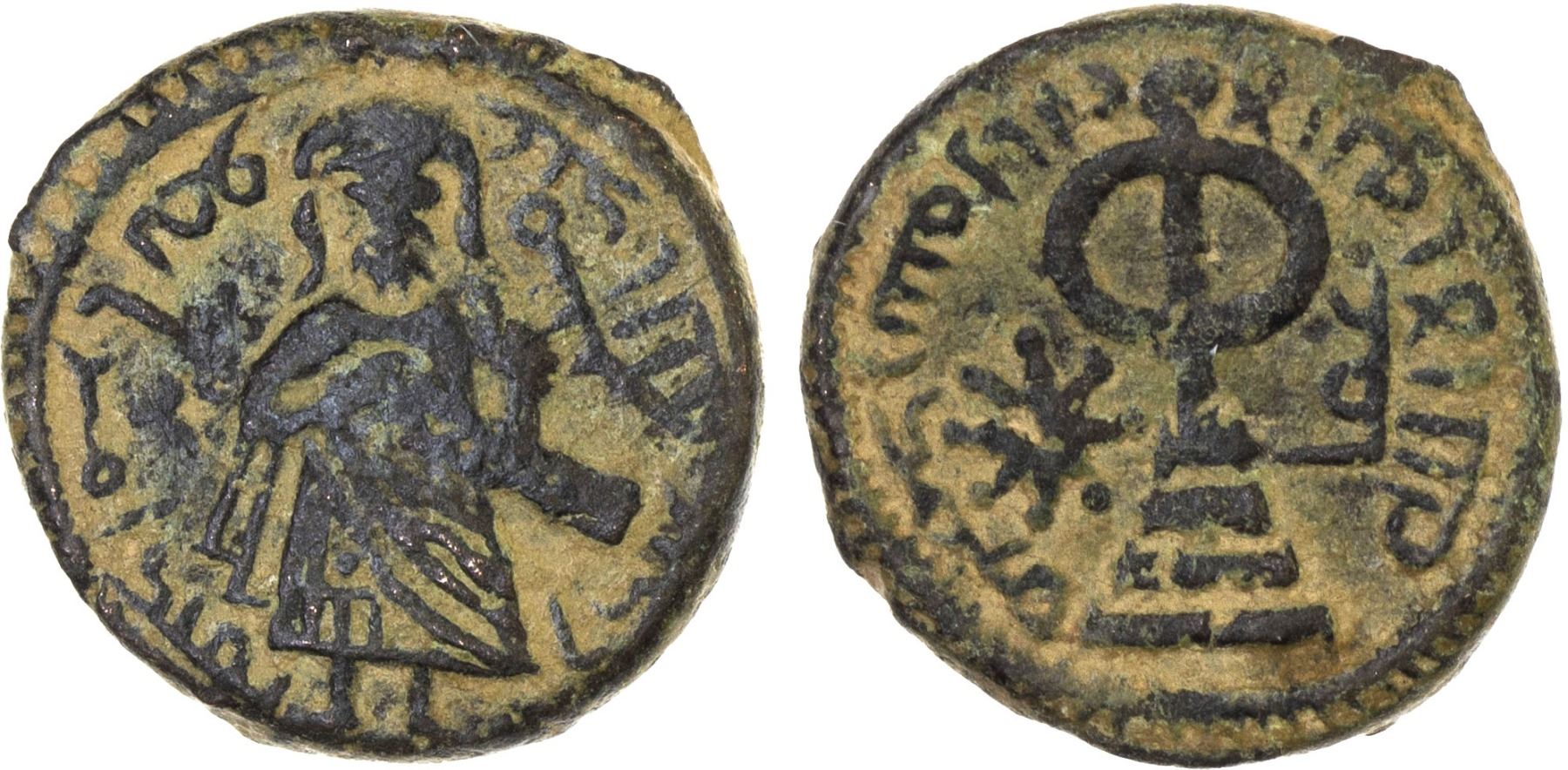 ARAB-BYZANTINE: Standing Caliph, ca. 692-697, AE fals (3.08g), 'Ammâ[n], A-3524, TG-139/162, citing the Umayyad caliph 'Abd al-Malik (685-705); superb example, without any weakness whatsoever; mint name without the final letter "N", occasionally noted on this type for unknown reasons, superb VF, R.