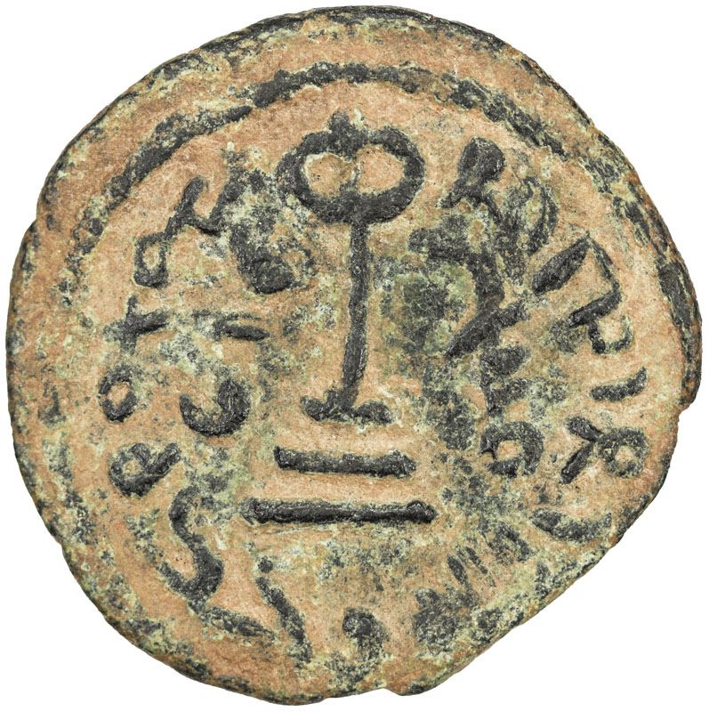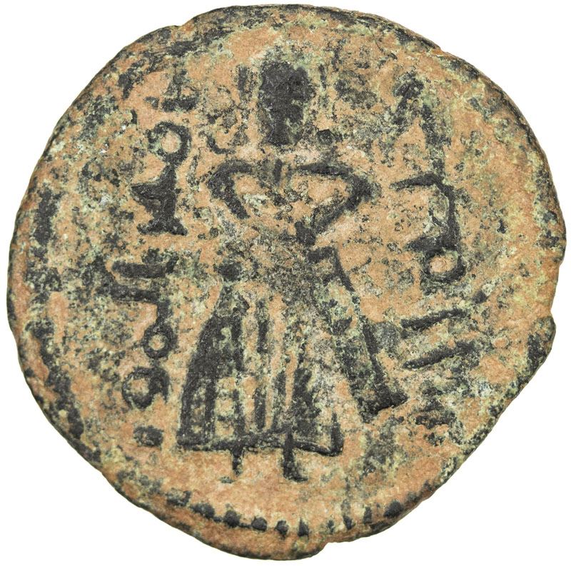 ARAB-BYZANTINE: Standing Caliph, ca. 692-697, AE fals (3.41g), Manbij, A-3533.1, W-102, with khalifat Allah instead of the caliph's name in obverse field, pleasing strike, Fine to VF, R.