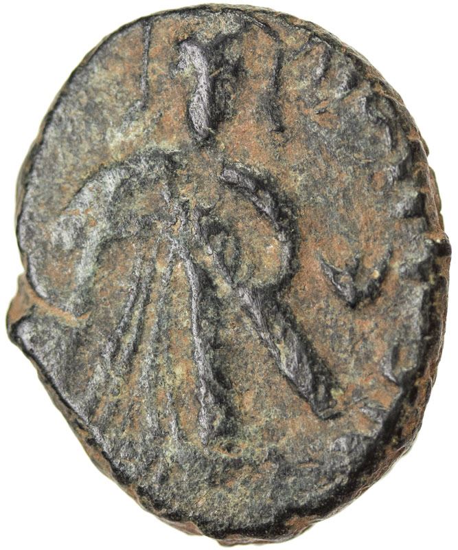 ARAB-BYZANTINE: Standing Caliph, ca. 692-697, AE fals (3.52g), A-3539, style of Hims mint, with star left of circle-on-steps, unusual variety with Greek E in right field on obverse, VF, R.