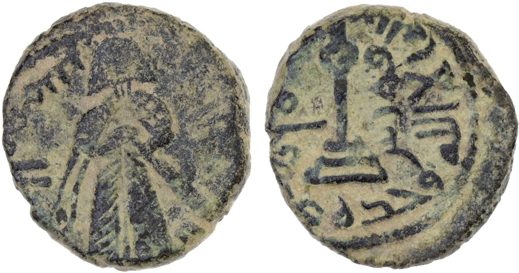 ARAB-BYZANTINE: Standing Caliph, ca. 692-697, AE fals (3.64g), Qûrus, VF
