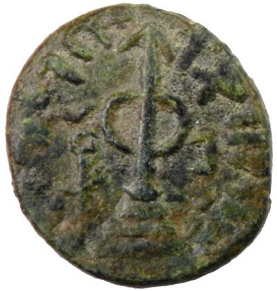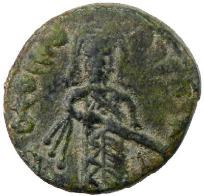 ARAB-BYZANTINE: Standing Caliph, ca. 692-697, AE fals (3.70g), "Dimashq", ND, A-3540.1, contemporary imitation, mint name retrograde (except for the letter d), anonymous, many misspellings, e.g., rasu for rasul in the reverse marginal text, Fine to VF.
