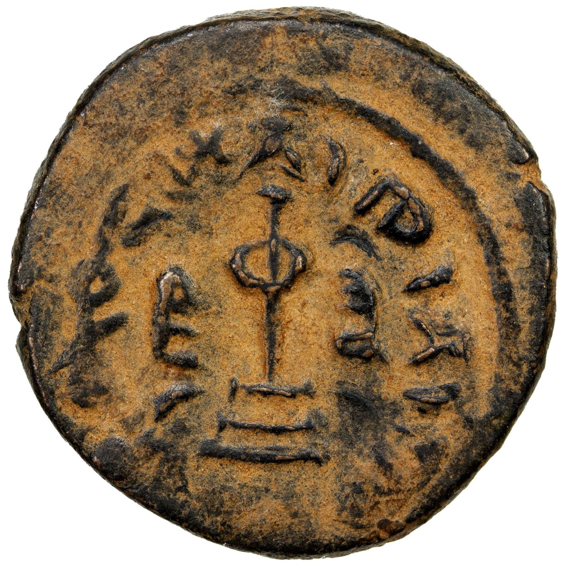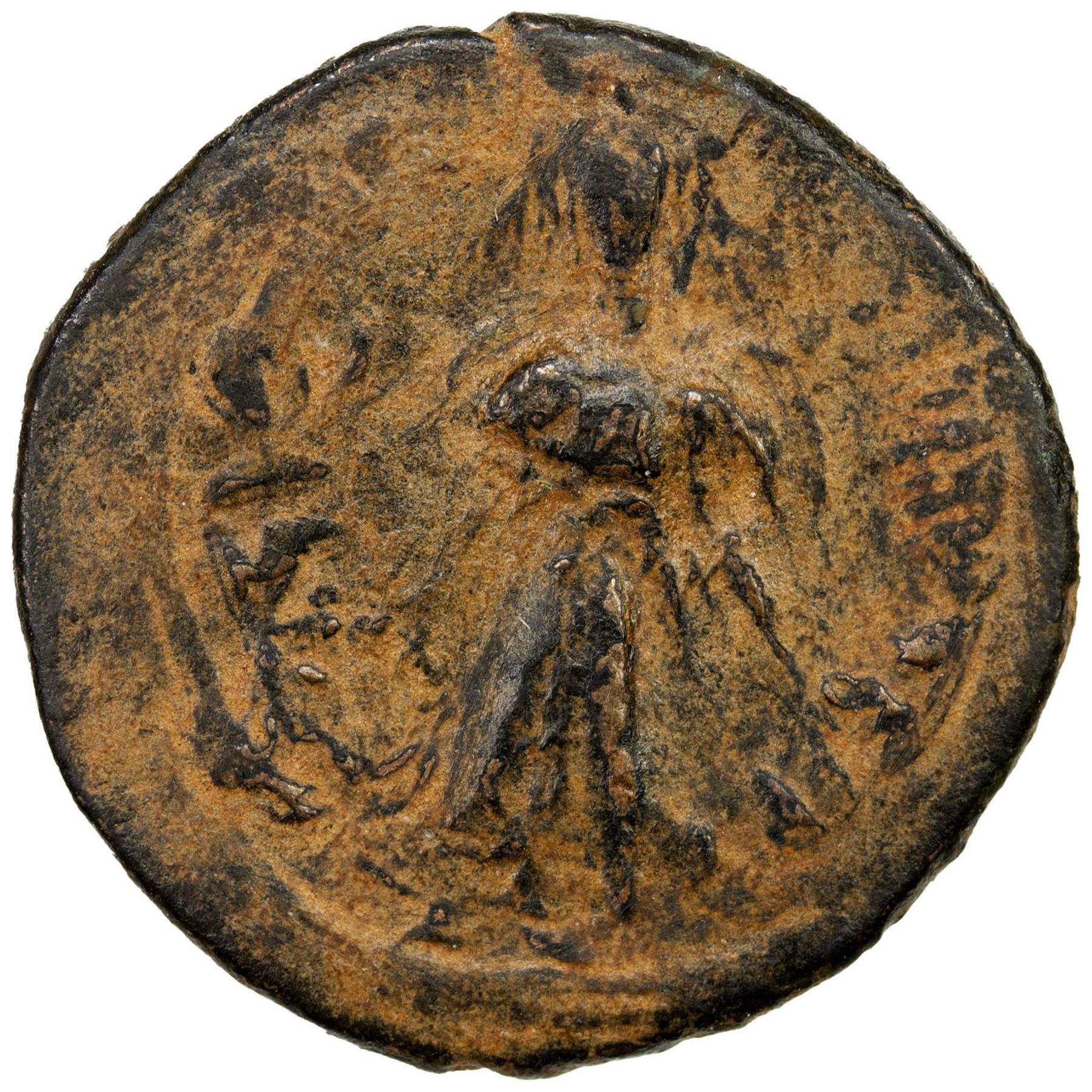 ARAB-BYZANTINE: Standing Caliph, ca. 692-697, AE fals (3.76g), NM, A-3544N, Goodwin, the kalima is arranged so that the last two words rasul / Allah replace the mint & waf on the reverse field, thus mintless; citing the caliph 'Abd al-Malik on the obverse, possibly unpublished, VF, RRR.