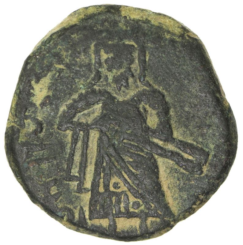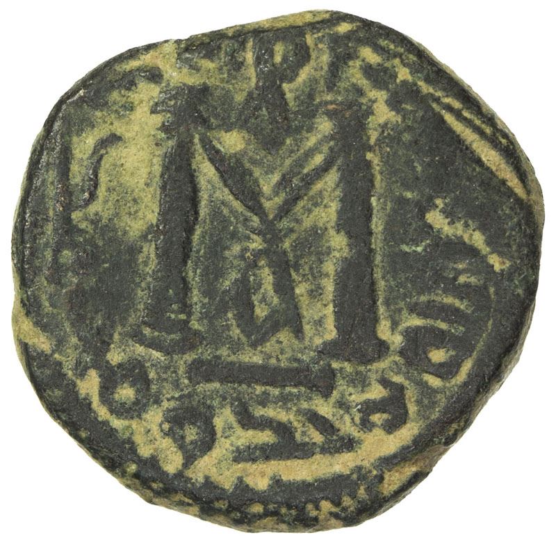 ARAB-BYZANTINE: Standing Caliph, ca. 693-700, AE fals (2.93g), ['Amman], ND, A-M3545, W-—, capital M instead of circle-on-steps, without mint name and without star, citing caliph 'Abd al-Malik on obverse, kalima on reverse, pleasing Fine to VF, RR.