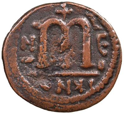 ARAB-BYZANTINE: Standing Emperor, ca. 660s-680s or later, AE fals (4.10g), Tabariya, A-3519, possibly unpublished, mint name in Arabic to left, duriba to right of standing emperor on obverse, IKNO below cursive m on reverse, with N above a bar to the left, cross above, and E between 2 symbols to right, some corrosion, especially over the emperor, excellent strike, nice Very Fine, RRR, from an American collection.  Emperor holds normal long cross in right hand, globus cruciger in left hand. Type not included in Bone's study.