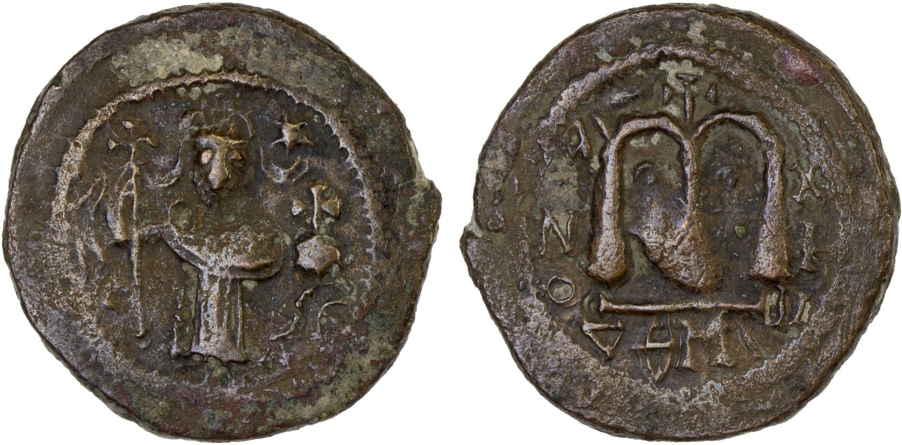 ARAB-BYZANTINE: Standing Emperor, ca. 680-700, AE fals (3.92g), 'Pseudo-Damascus", A-3522.1, standing figure holding long cross and globus cruciger, with star and crescent in the upper right field // cursive "m" with stylized mint name DAMI below and cross above, bold VF, RR.