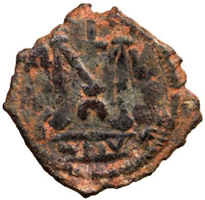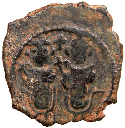 ARAB-BYZANTINE: Two Standing Figures, ca. 680s, AE fals (3.89g), Ba'albakk, A-3513.2, Bone-2.4var, cross above & downward crescent below capital M, Very Fine, R, from an American collection.  Neither figure holds the globus cruciger. The Greek mint name is somewhat coarsely engraved.