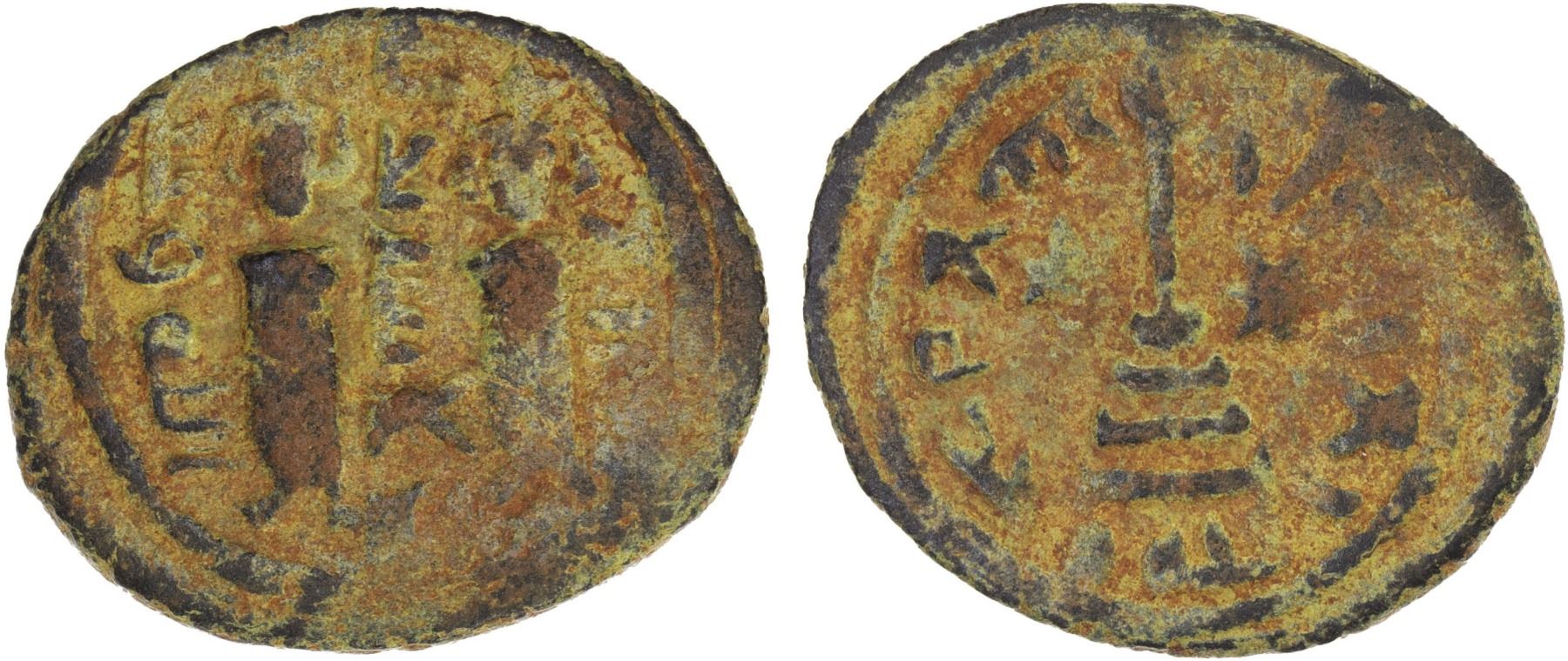 ARAB-BYZANTINE: Two Standing Figures, ca. 690s, AE fals (2.73g), NM, F-VF