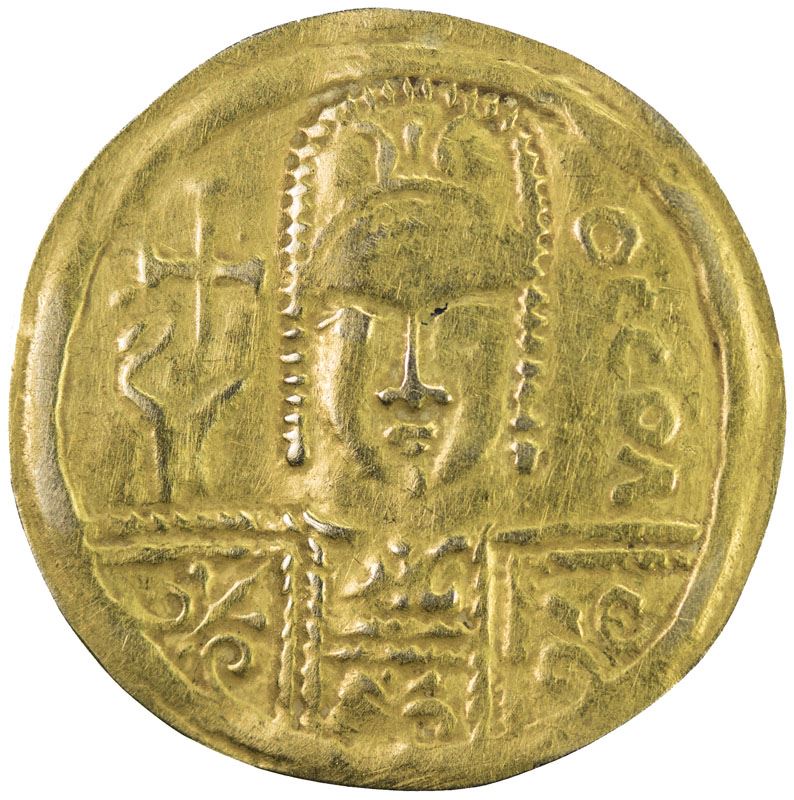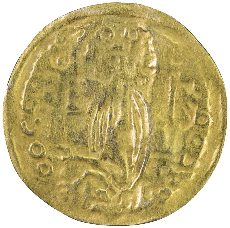 ARAB-SASANIAN: AV imitative tremissis (1.29g), 7th/8th century, stylized facing bust, derived from either Justinian I (527-565) or Mauritius (582-602), with his right hand holding up a cross potent, with pseudo-Greek OCCOA to right / standing figure, facing right, his arms stretched out to the right, meaningless "Greek" legend around, VF, RRR. Reportedly found in Afghanistan, this type was usually produced for ceremonial burial of the deceased, traditionally placed on the forehead of the corpse. The reverse design is conceivably based on the standing caliph design with his hands raised, as found on the reverse of Arab-Sasanian pashiz in the name of al-Hajjaj b. Yusuf (694-713) (Gyselen-78, 79). It could also represent the Christian angel of the Byzantine gold coinage, often facing right on the tremissis denomination, with the wings fashioned as a cloak, and a stylized long cross to the left.