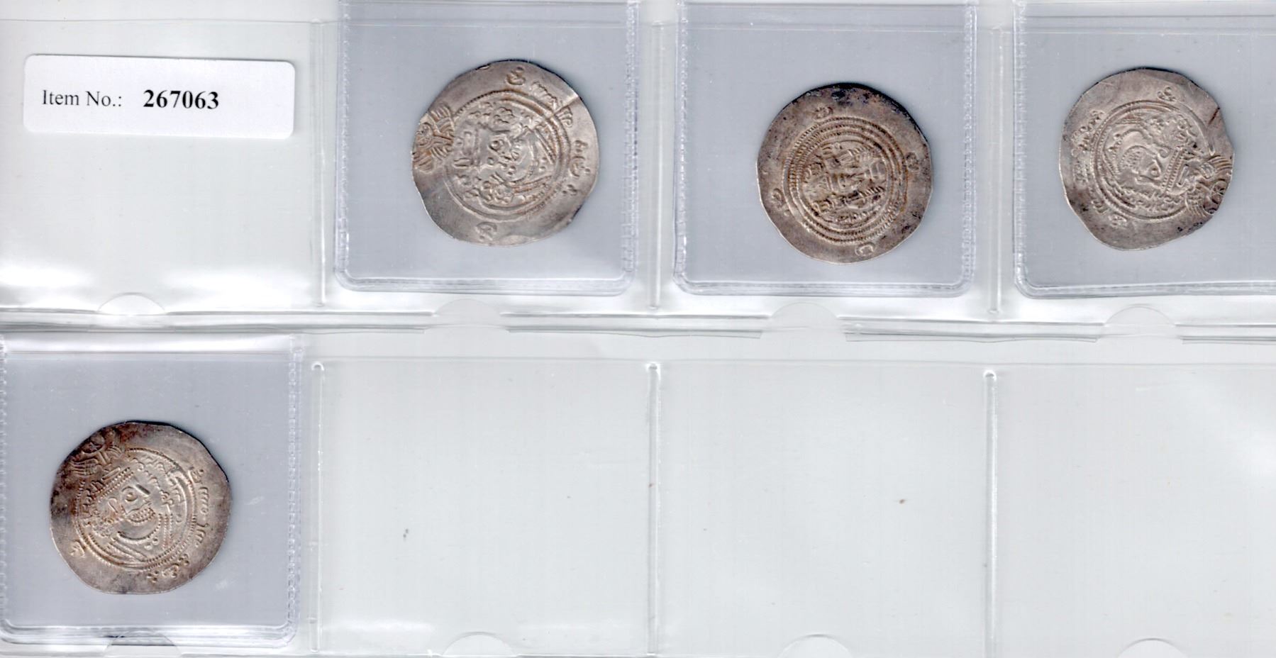 ARAB-SASANIAN: 'Abd Allah b. al-Zubayr, 680-692, LOT of 4 silver drachms, all EF but with minor defects: DA (Darabjird), date YE53 (creased); DA, dated YE59 (slight hornsilver near the rim); DA+GH, dated YE60 (2 pcs, one with couple edge nicks, one choice except for touch of discoloration); retail value $350, lot of 4 pieces.