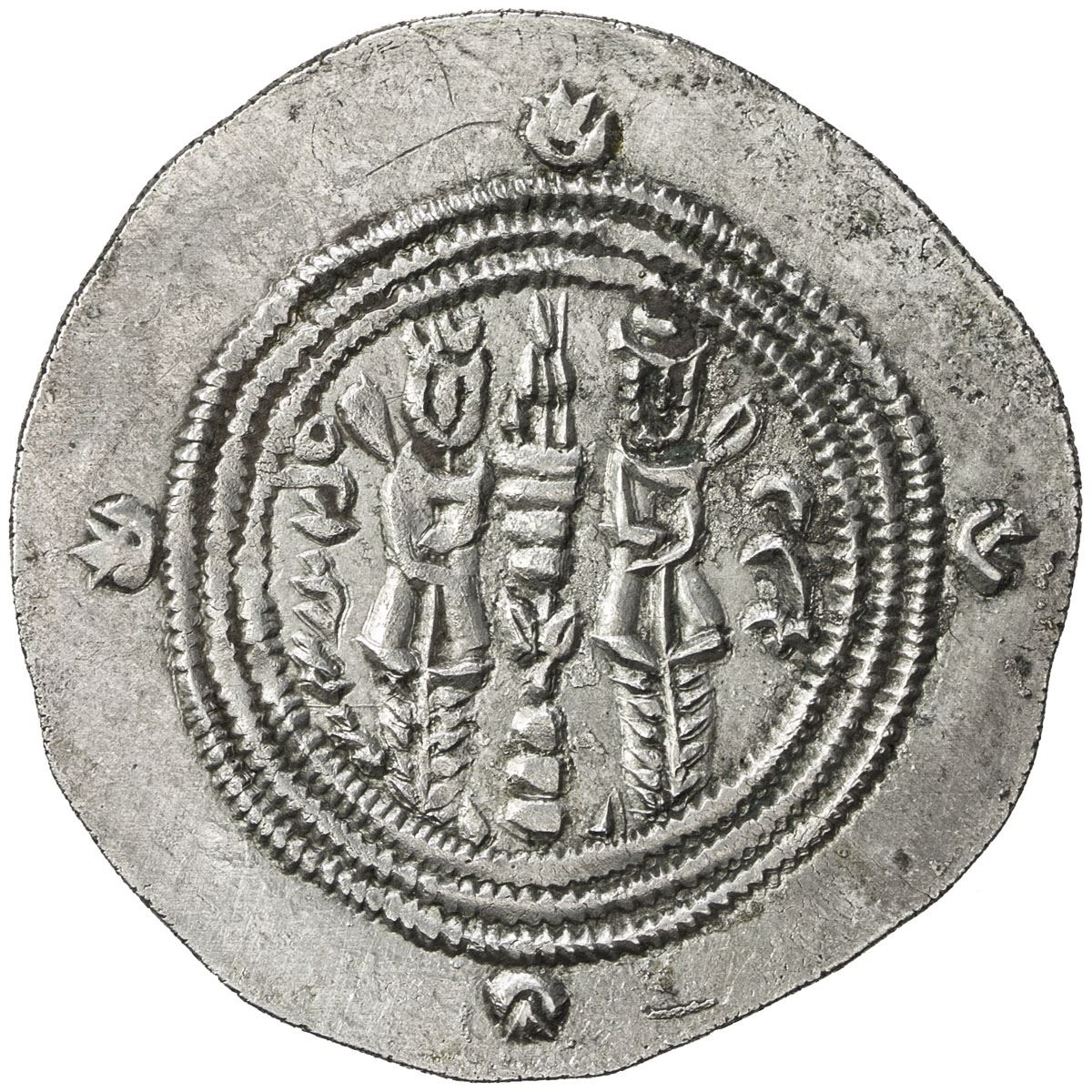 ARAB-SASANIAN: 'Abd al-Rahman b. Muhammad, 700-703, AR drachm (3.74g), SK (Sijistan), AH82, A-38A, extra single pellet left of the wings in the obverse margin, EF.