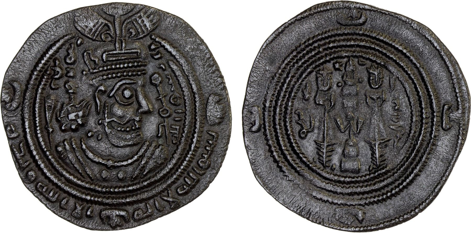 ARAB-SASANIAN: Anonymous, AR drachm (3.48g), AKWLA (al-Kufa), A-34G, Malek-12 (different dies), with muhammad rasul Allah replacing the governor's name right of the portrait, with bism Allah la ilah / illa Alla wahdahu filling ObQ2 and ObQ3 // mint name in the usual location, but undeciphered symbol or monogram replacing the date; 4th outer circle added on the reverse; exceedintly rare, only the 2nd known example! XF, RRRR. This is a newly discovered Arab-Sasanian drachm with "Muhammad Rasul Allah" instead of the ruler or governor's name before the obverse portrait, and only one of two known from the mint of AKWLA (al-Kufa). The three previously known versions (A-34D, 34E, 34F) are likely all produced during the AH70s (690s) and all are of extreme rarity.