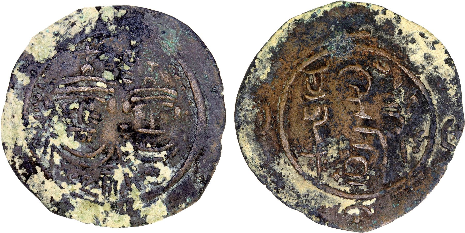 ARAB-SASANIAN: Anonymous, ca. 700-720, AE pashiz (1.34g), Gyanbud (Qasr-i Abu Nasr), A-43B, Gyselen-80, two Byzantine busts, with cross on crown, as Heraclius & his son Heraclius Constantine // single attendant standing at left, with location name Gyanbud in vertical Pahlavi script to right, discolored, VF, RRR.