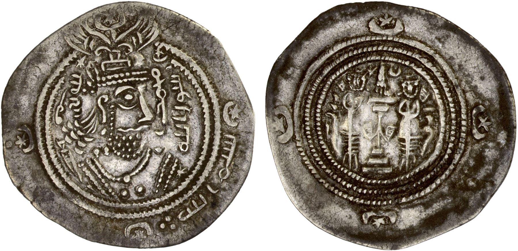 ARAB-SASANIAN: Anonymous, mid 690s, AR experimental drachm (3.67g), A-34F, Zeno-109364 (erroneously filed under the mint of YZ for Yazd), standard obverse, with the usual bism Allah in ObQ2, but with the phrase muhammad rasul Allah instead of the governor's name before the portrait // standard reverse, blundered mint name (perhaps derived from WYH), and crude "date" probably derived from Pahlvai sabah ("7"), choice VF, RRRR. This is one of several experimental drachms introduced during the 690s, before the final monetary reform of 696-698 (AH 77-79). The only other example on CoinArchives was sold in the Islamic Coin Auction 19, lot 1 (April 2012), rather fancifully described. The blundered mint & date suggest that this type may have been produced somewhere in northwestern Iran or the Caucasus.