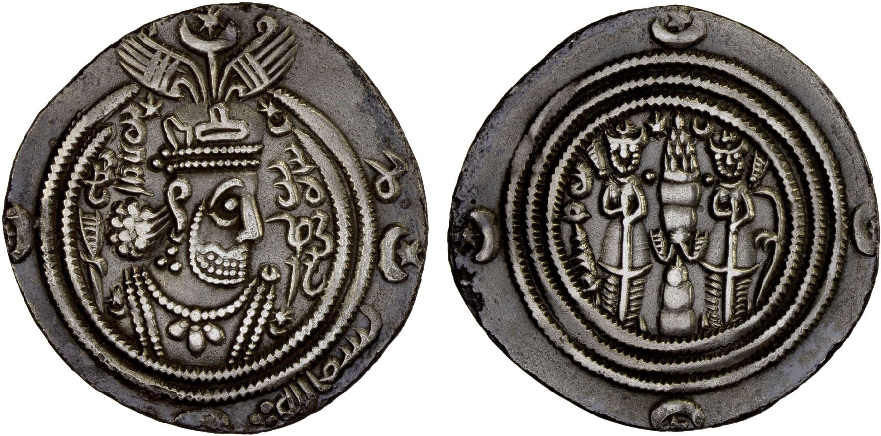ARAB-SASANIAN: Aslam (Asram) b. 'Anfawa, fl. 686, AR drachm (2.66g), GD (Jayy), AH67, A-F27, standard obverse with the Pahlavi name read as aslm i awpawa, though the patronymic seems more like swphan, with small Pahlavi monogram in ObQ1 // standard reverse with clear mint & date, clipped down to a later standard, VF. The only other known example is in the Fitzwilliam Museum, #CM.IS.31-R. This is the second known example. The Fitzwilliam example is illustrated by Hodge Malek in Volume I, p. 272, with a brief discussion of what little might be known of this governor.