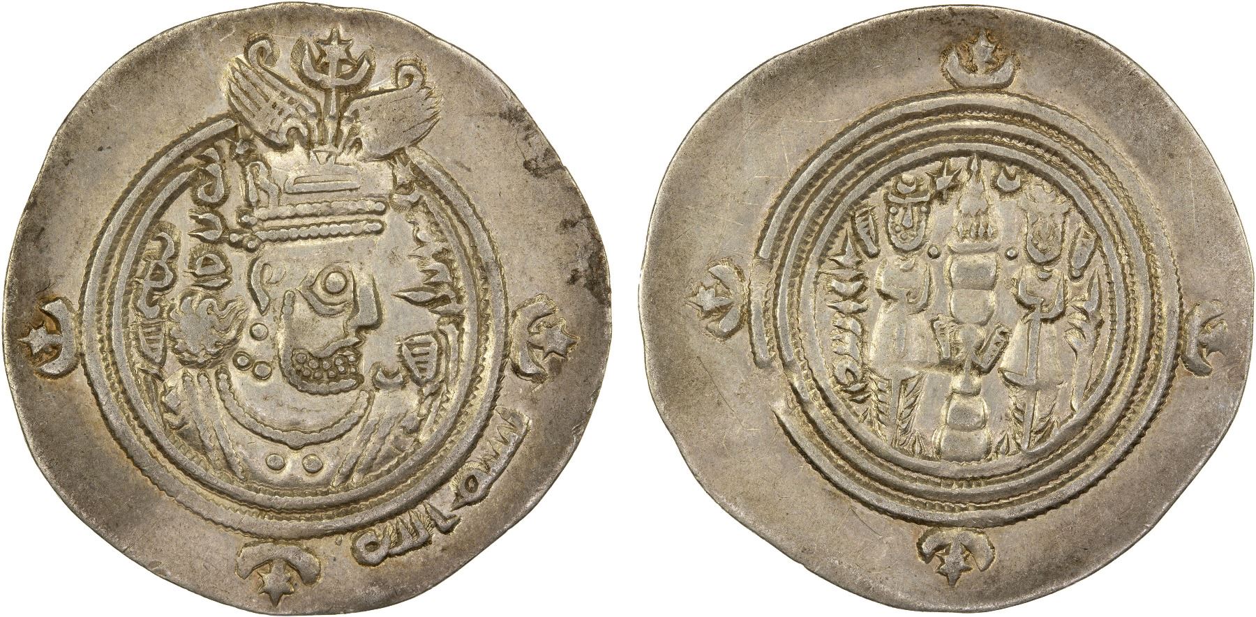 ARAB-SASANIAN: Khusraw type, ca. 653-670, AR drachm (3.60g), ShY (Shiraz), YE25, VF-XF