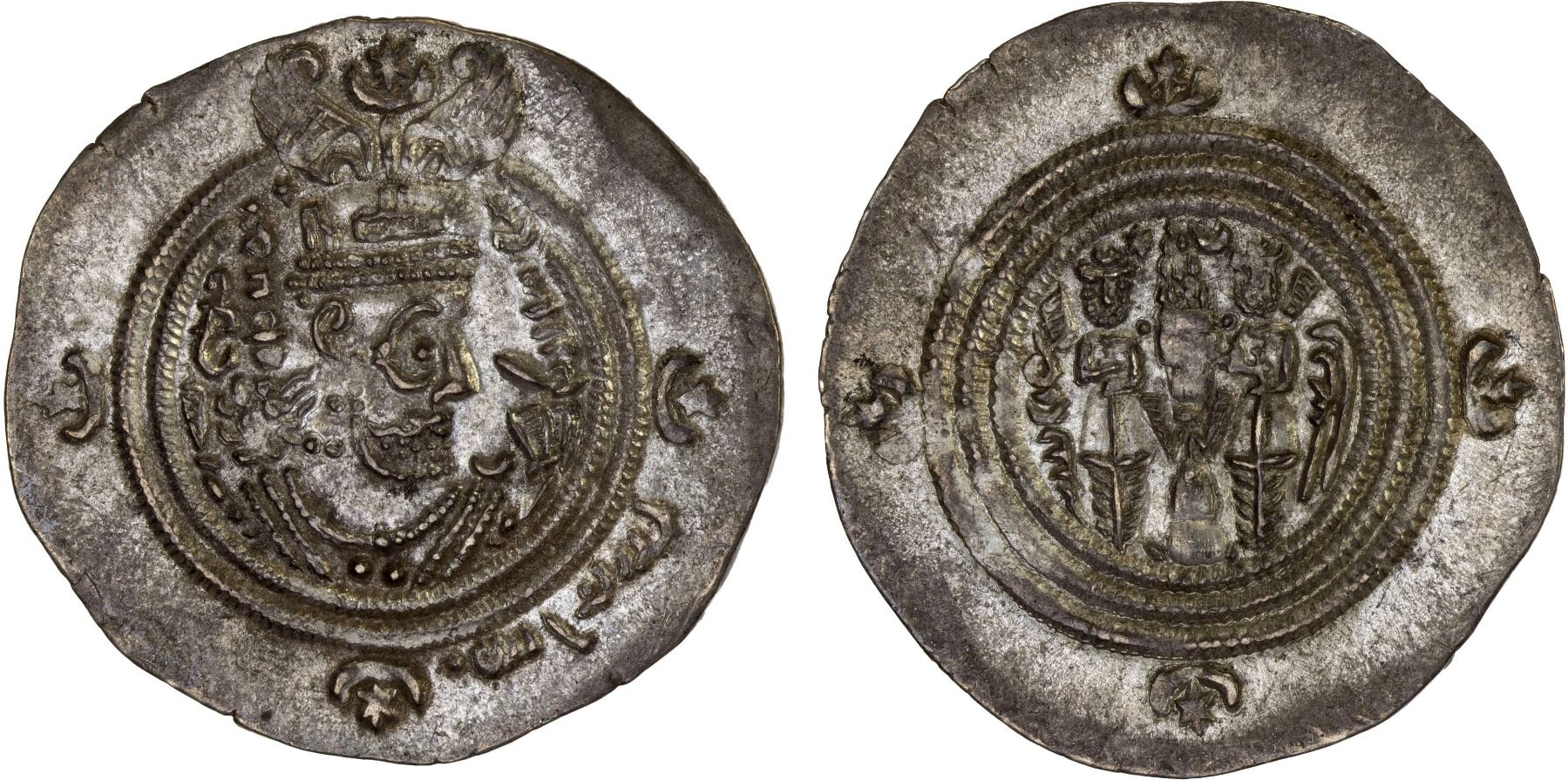 ARAB-SASANIAN: Khusraw type, ca. 653-670, AR drachm (3.99g), BYSh (Bishapur), year 35, choice XF