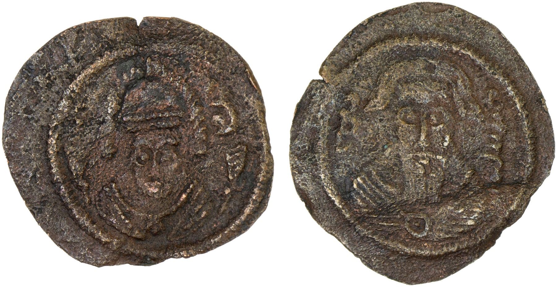 ARAB-SASANIAN: Muhallab, ca. 694-698, AE pashiz (0.71g), ST (Istakhr), A-31E, Gyselen-23, facing bust on both sides, royal figure on obverse (with governor's name in Pahlavi to right) // Anahita type figure on reverse; porous surfaces, F-VF, R.