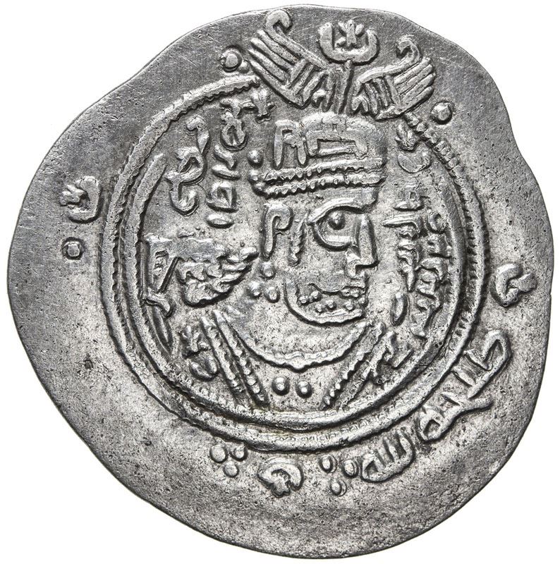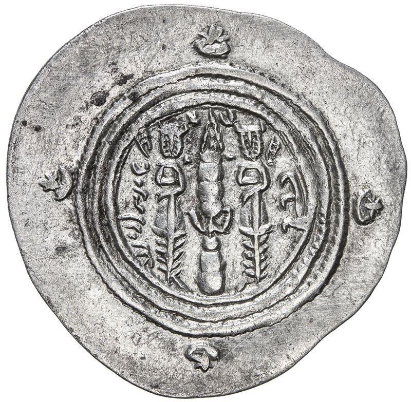 ARAB-SASANIAN: Talha b. 'Abd Allah, fl. 683-685, AR drachm (3.92g), SK (Sijistan), AH64, A-26, with talha lillah instead of bism Allah in ObQ2, plus extra single pellets flanking the wings and at 8:30 in the obverse margin, VF-EF, R.