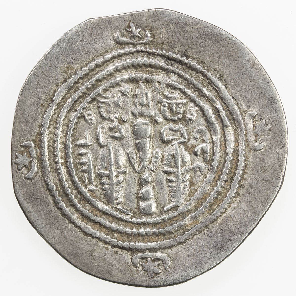 ARAB-SASANIAN: Yazdigerd type, 652-668, AR drachm (3.08g), SK (Sijistan), YE20 (frozen), A-1, first Islamic coin, distinguished from the last regular Sasanian issue of the same year by the addition of Arabic bism Allah in ObQ2, VF.