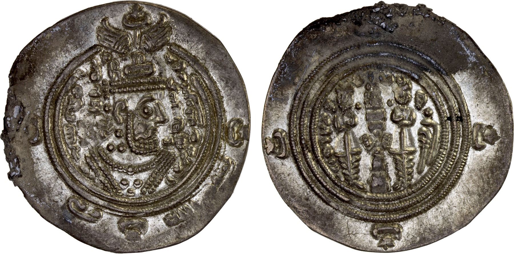 ARAB-SASANIAN: Ziyad b. Abi Sufyan, 665-673, AR drachm (3.65g), BYSh (Bishapur), AH51, A-8, some hornsilver at the margins, but not affecting the image or legends, XF.