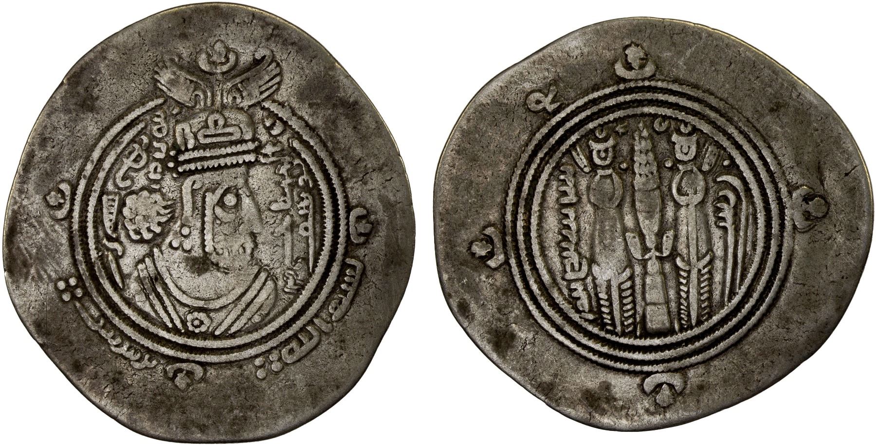 ARAB-SASANIAN: al-Hajjaj b. Yusuf, 694-713, AR drachm (3.84g), BYSh (Bishapur), AH81, A-35.2, very rare subtype, with the name al-Hajjaj repeated in Pahlavi (hagag) in ObQ3; evenly worn, Fine, RR.