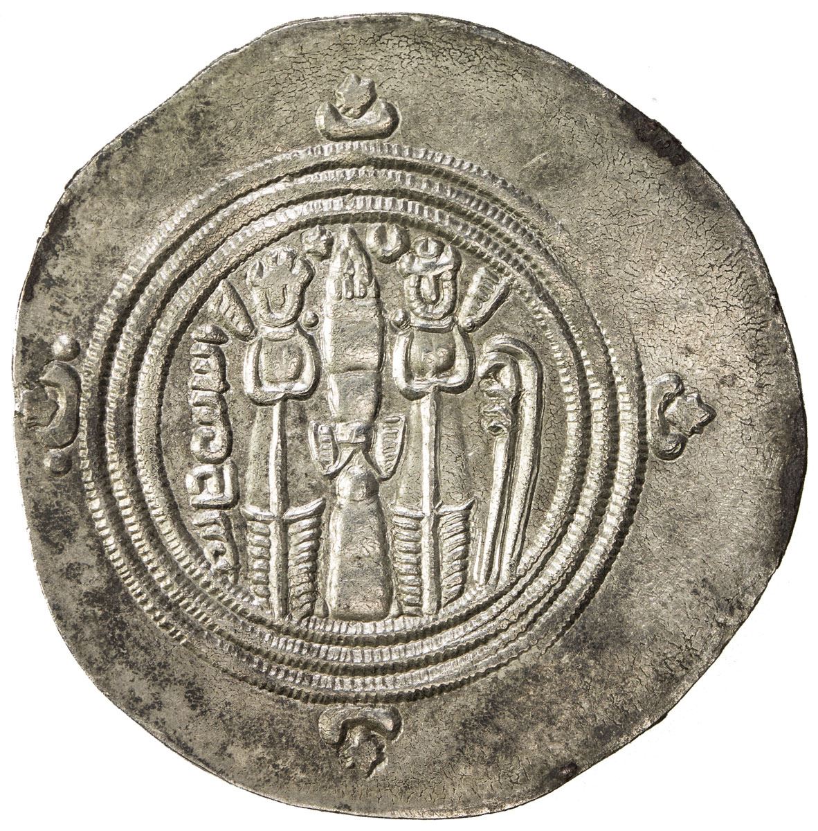 ARAB-SASANIAN: al-Hajjaj b. Yusuf, 694-713, AR drachm (3.87g), BYSh (Bishapur), AH79, A-35.2, only bism Allah in the obverse field, two very thin scratches in the obverse field (barely visible), VF-EF.