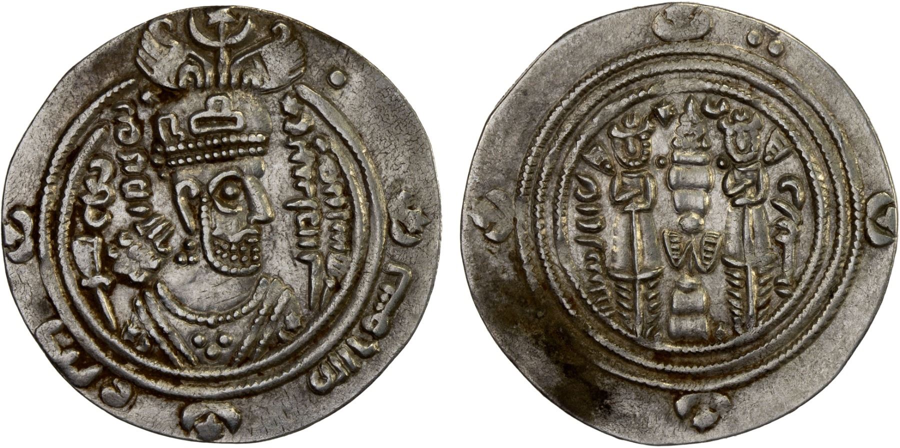ARAB-SASANIAN: al-Harith b. 'Abd Allah, 683-684, AR drachm (2.98g), DShT (Dasht Mishan), AH65, A-13, Malek, with a peculiar symbol or word (probably Pahlavi) in ObQ3, still undeciphered; clipped down to the post-reform standard, but still very attractive, bold VF, RRR. The only example on CoinArchives of this mint for al-Harith was sold in our Auction 17, lot 76 (in 2013), heavily clipped and lower grade. Malek reported only two more examples in museums.