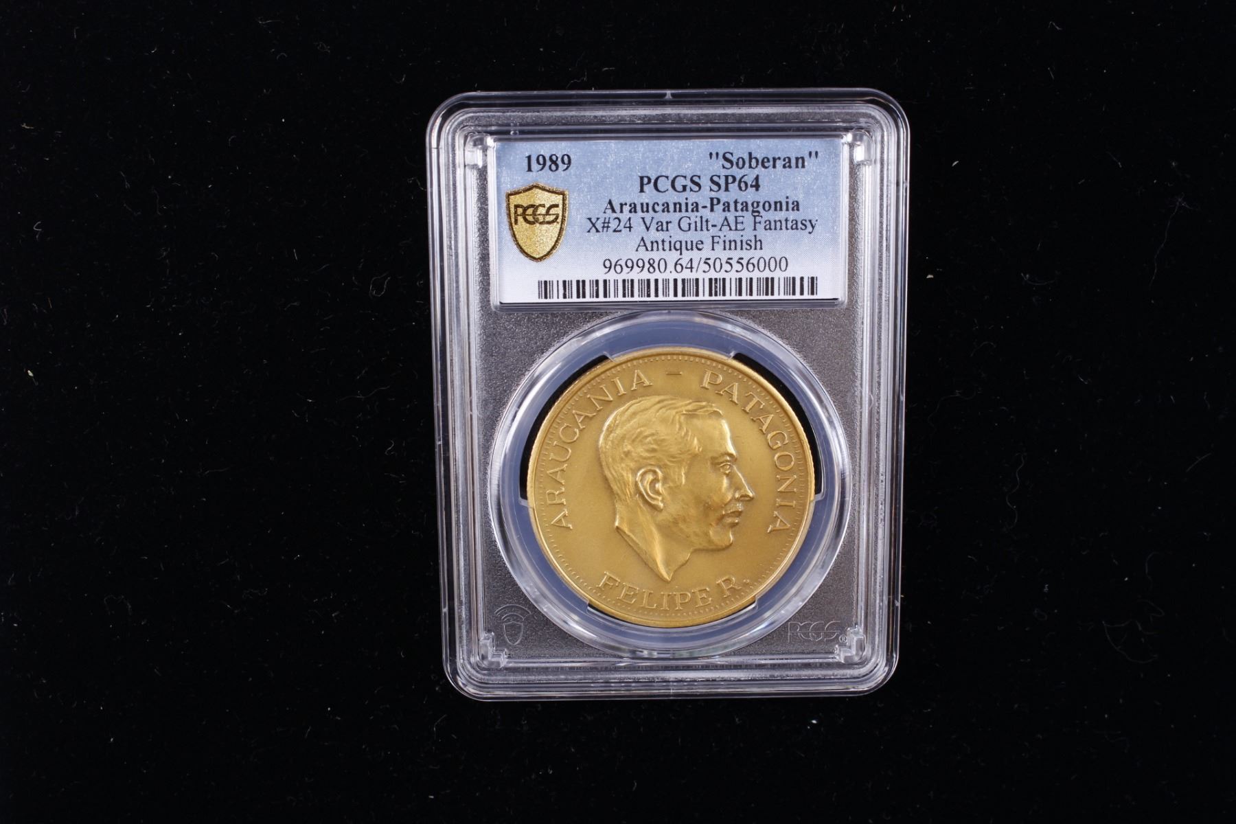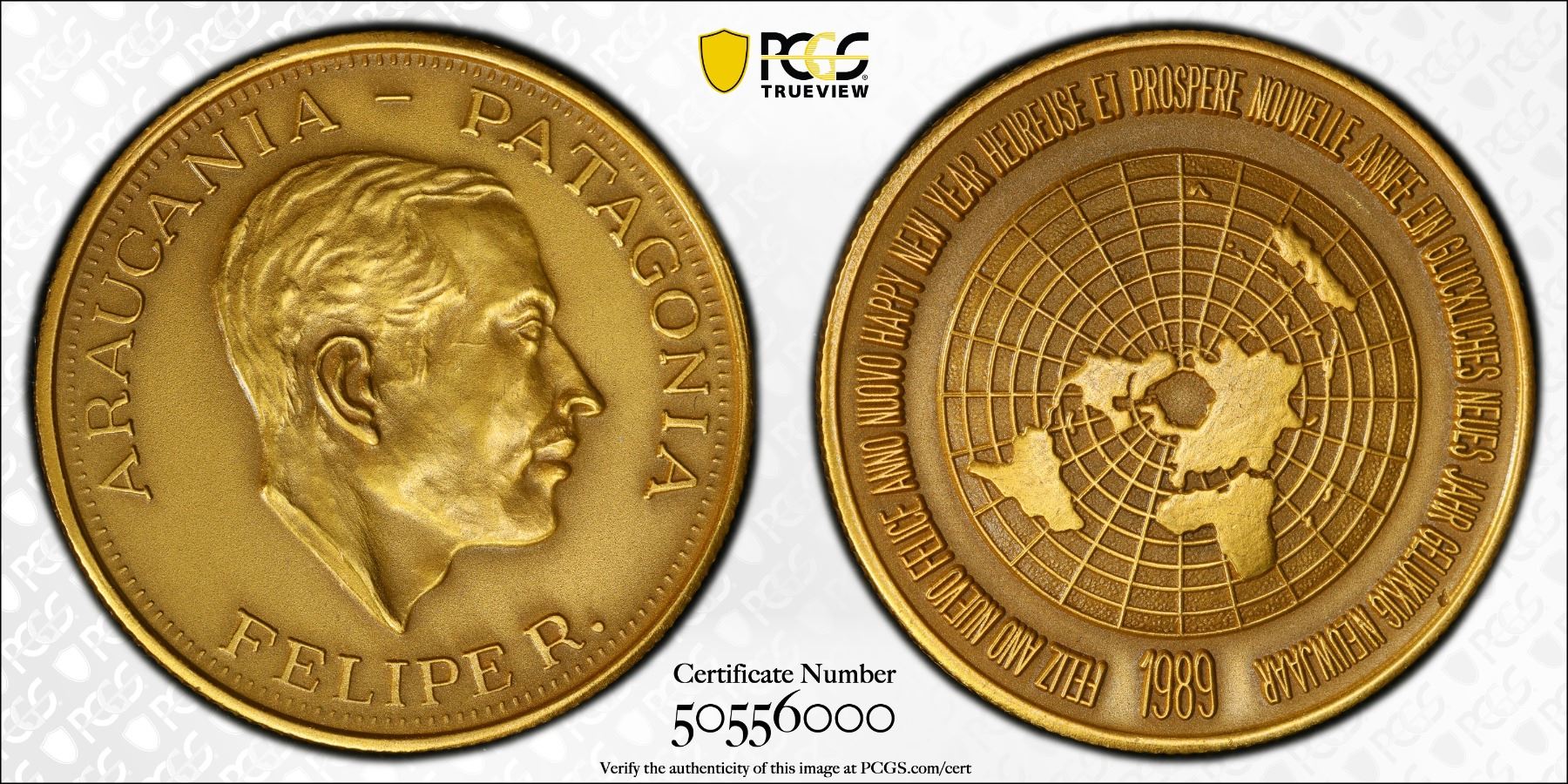ARAUCANIA AND PATAGONIA: Felipe I, 1952-2014, 1 soberano, 1989, KM-X24, fantasy issue struck in antiqued gilt bronze, Happy New Year in six languages, PCGS graded Specimen 64. Philippe Paul Alexandre Henri Boiry (1927-2014) was a journalist and a pretender to the throne of the Kingdom of Araucanía and Patagonia from October 26, 1952 to January 5, 2014. This fantasy type was struck at the Maison de Frappe FDC, a private mint in Quebec, by Serge Huard. See http://www.araucanie.com/Muenzen.pdf for more information.