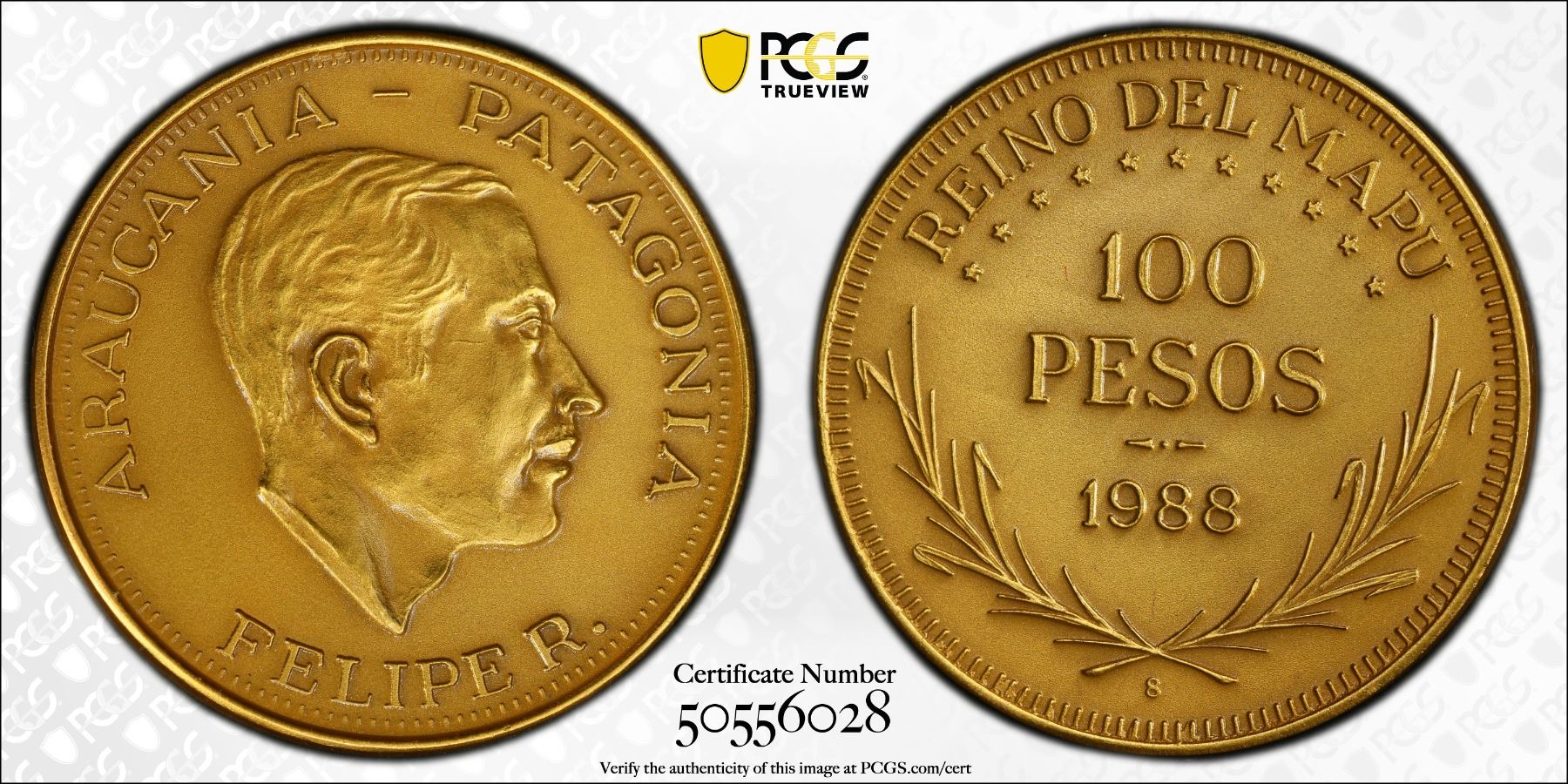 ARAUCANIA AND PATAGONIA: Felipe I, 1952-2014, 100 pesos, 1988, PCGS Specimen 63