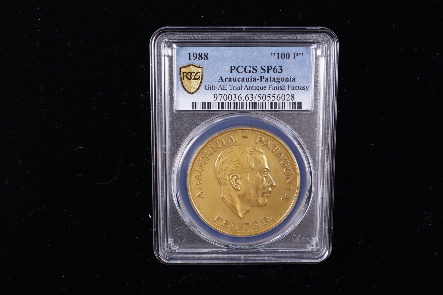 ARAUCANIA AND PATAGONIA: Felipe I, 1952-2014, 100 pesos, 1988, fantasy issue struck in antiqued gilt bronze, first issue of Felipe I, PCGS graded Specimen 63. Philippe Paul Alexandre Henri Boiry (1927-2014) was a journalist and a pretender to the throne of the Kingdom of Araucanía and Patagonia from October 26, 1952 to January 5, 2014. This fantasy type was struck at the Maison de Frappe FDC, a private mint in Quebec, by Serge Huard. See http://www.araucanie.com/Muenzen.pdf for more information.